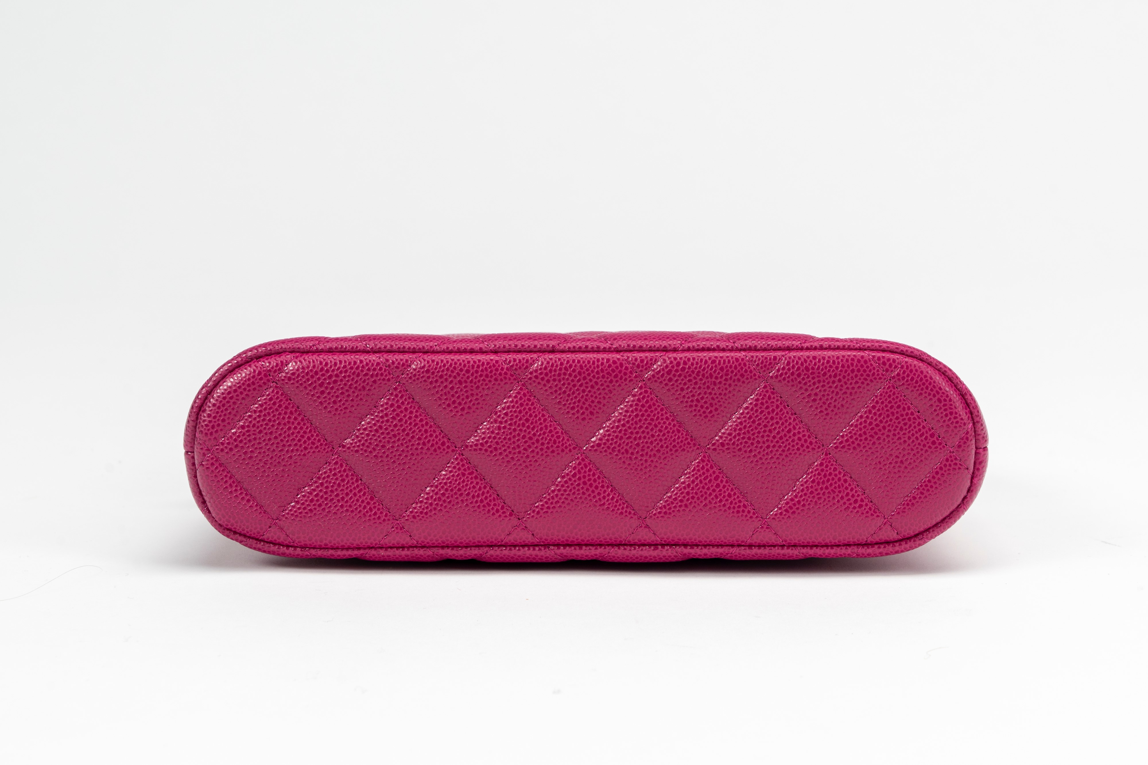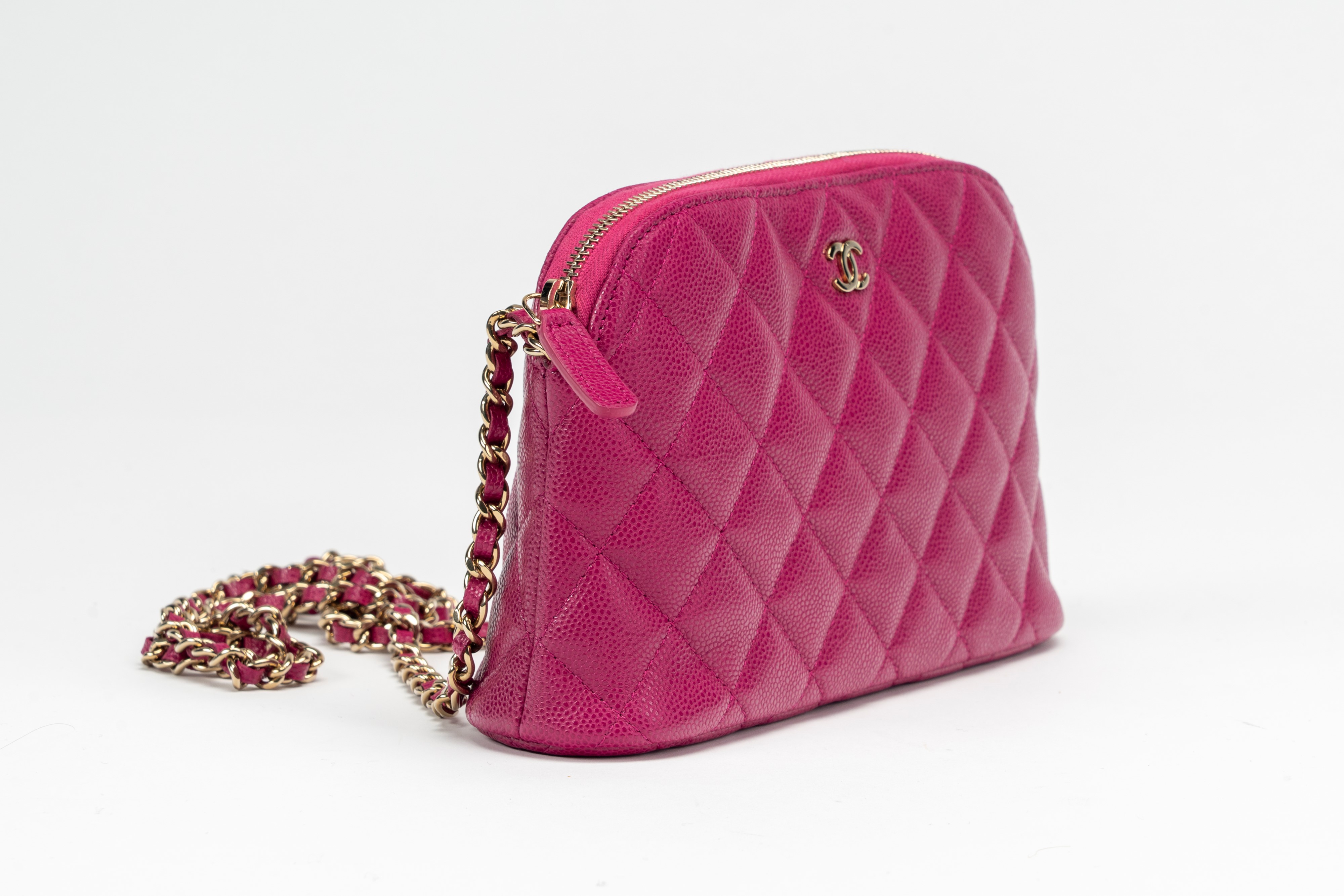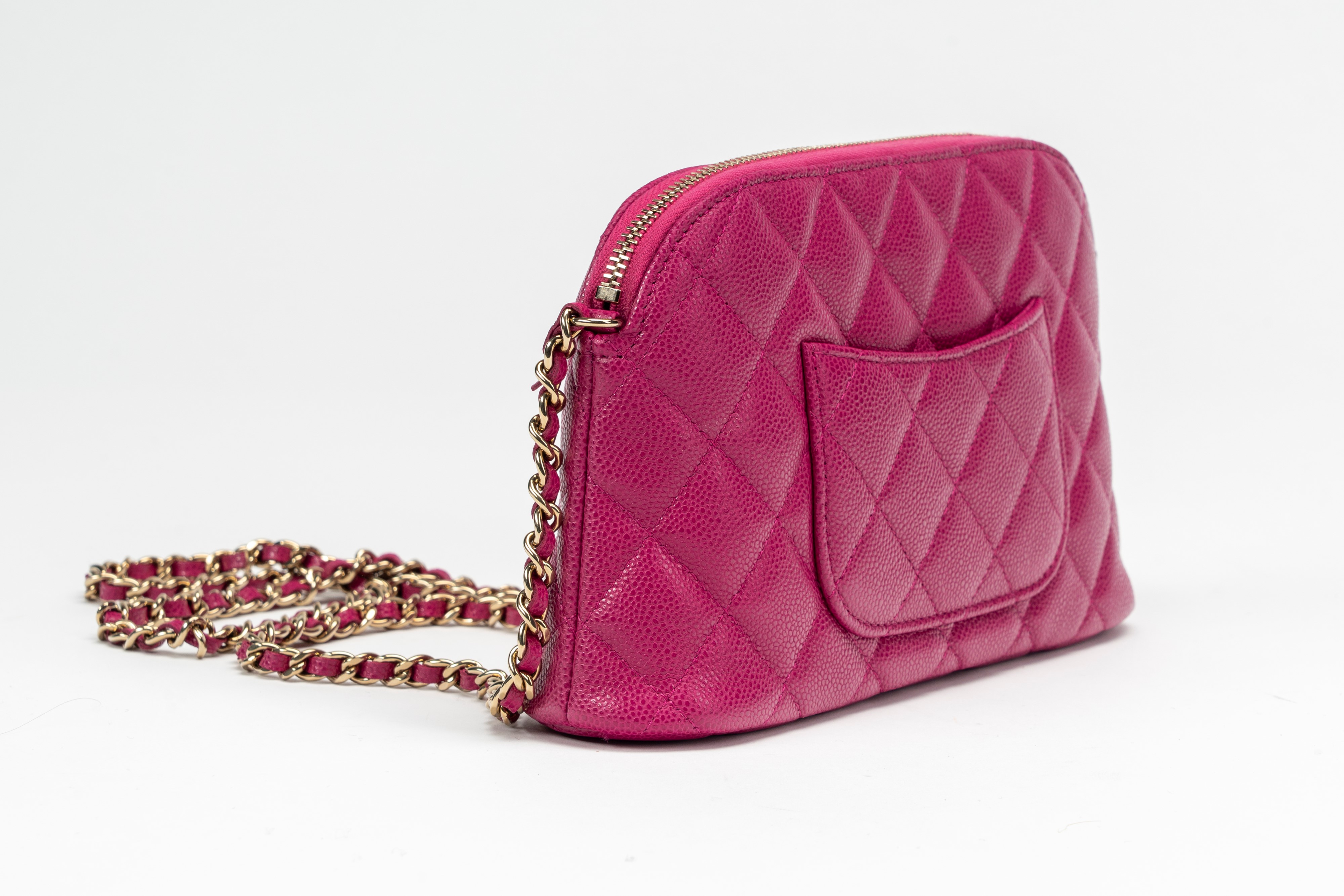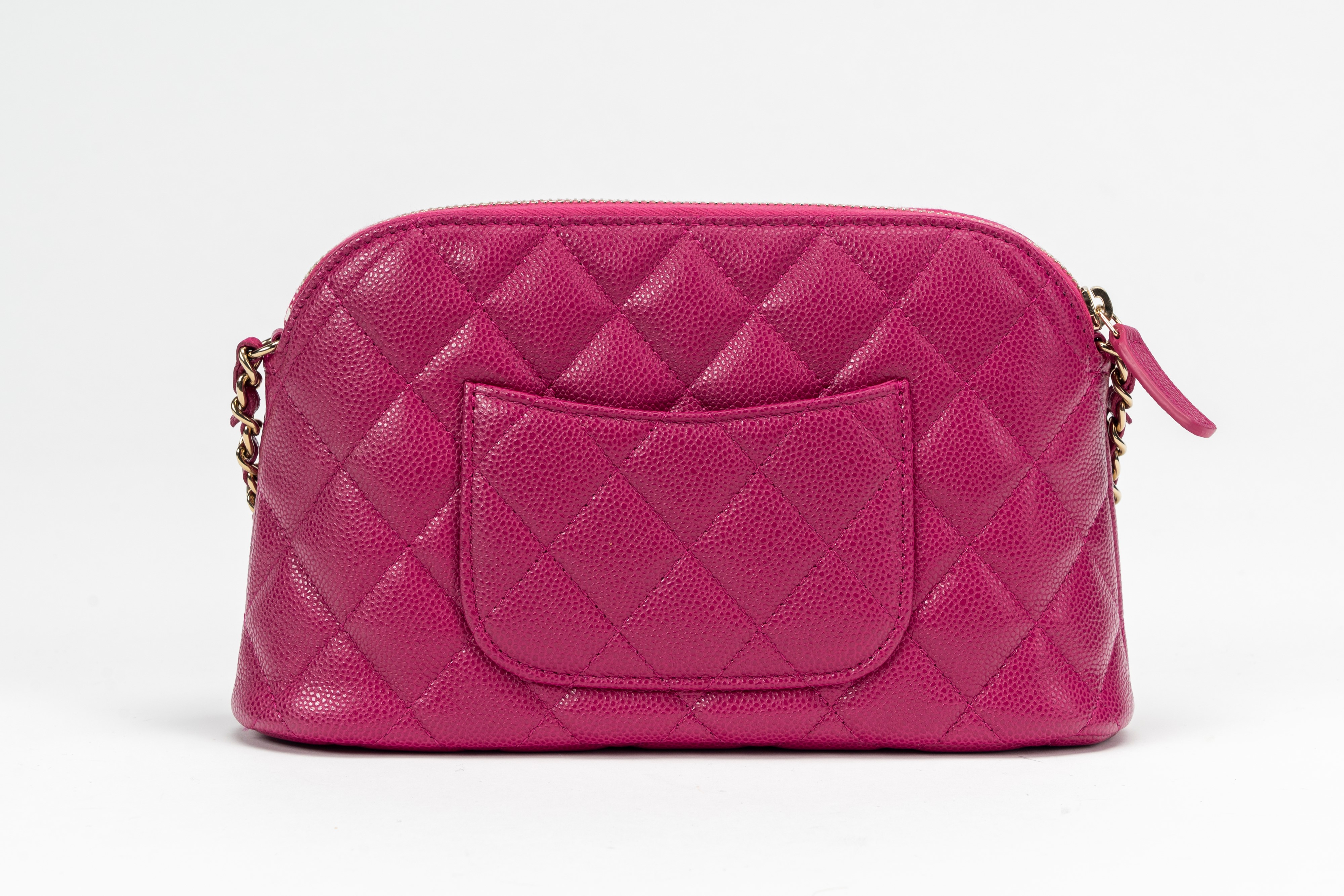in pelle caviar matelassé color fucsia, dettagli in metallo dorato, tracolla a catena, cm 20, con sacchettoBase d'asta