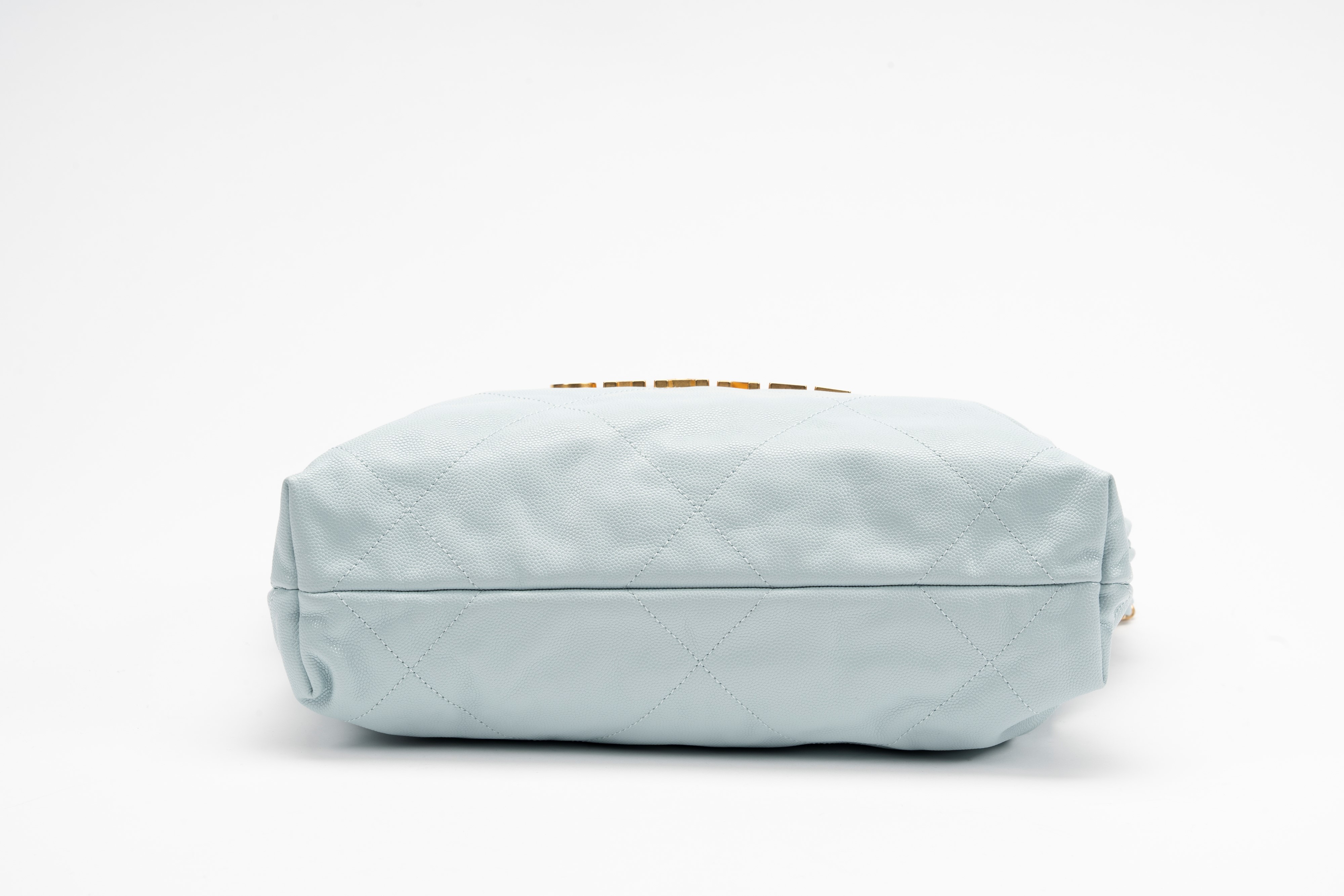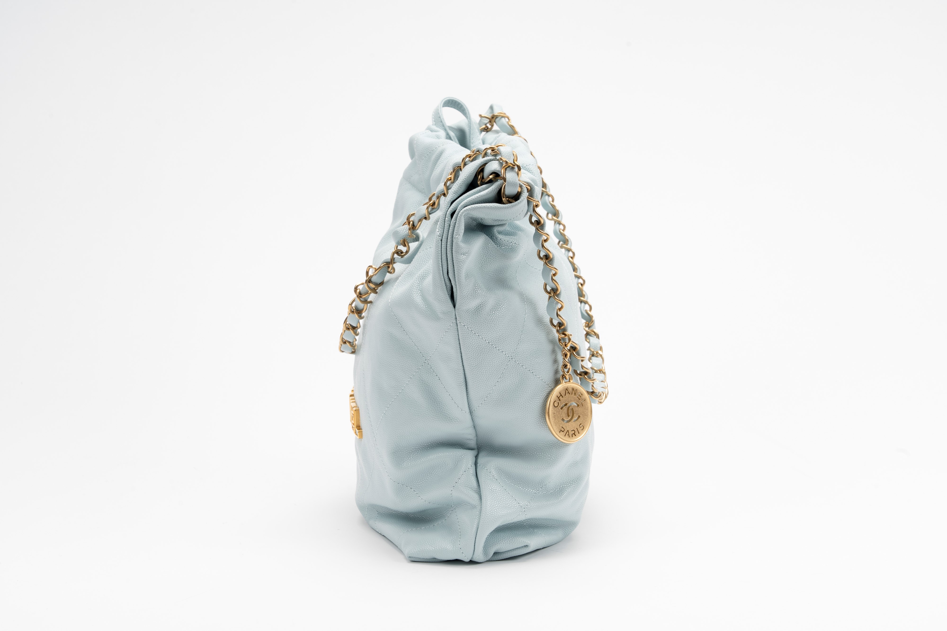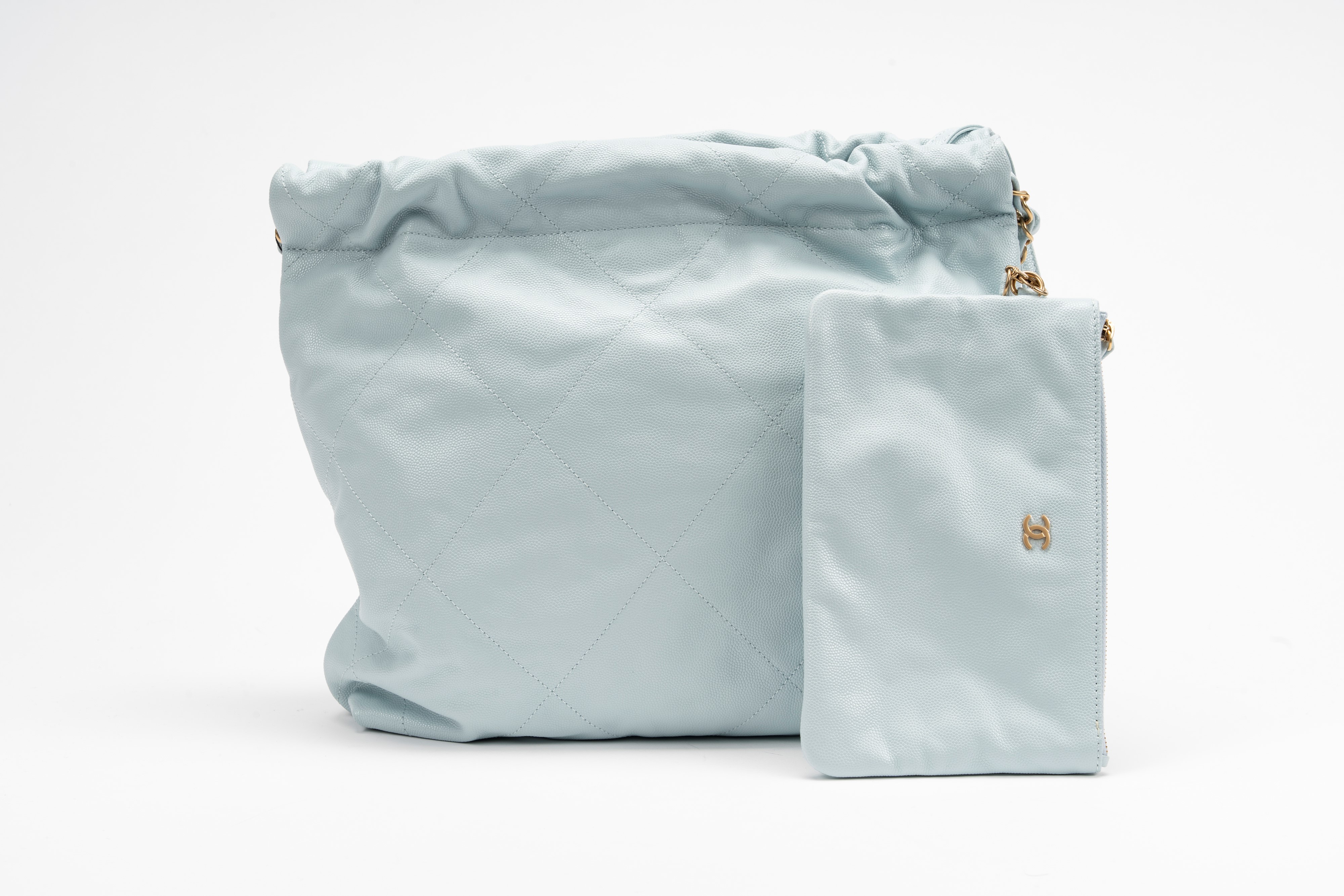 in pelle caviar color azzurro, tracolla e dettagli in metallo dorato, con pouch interna, cm 30Base d'asta