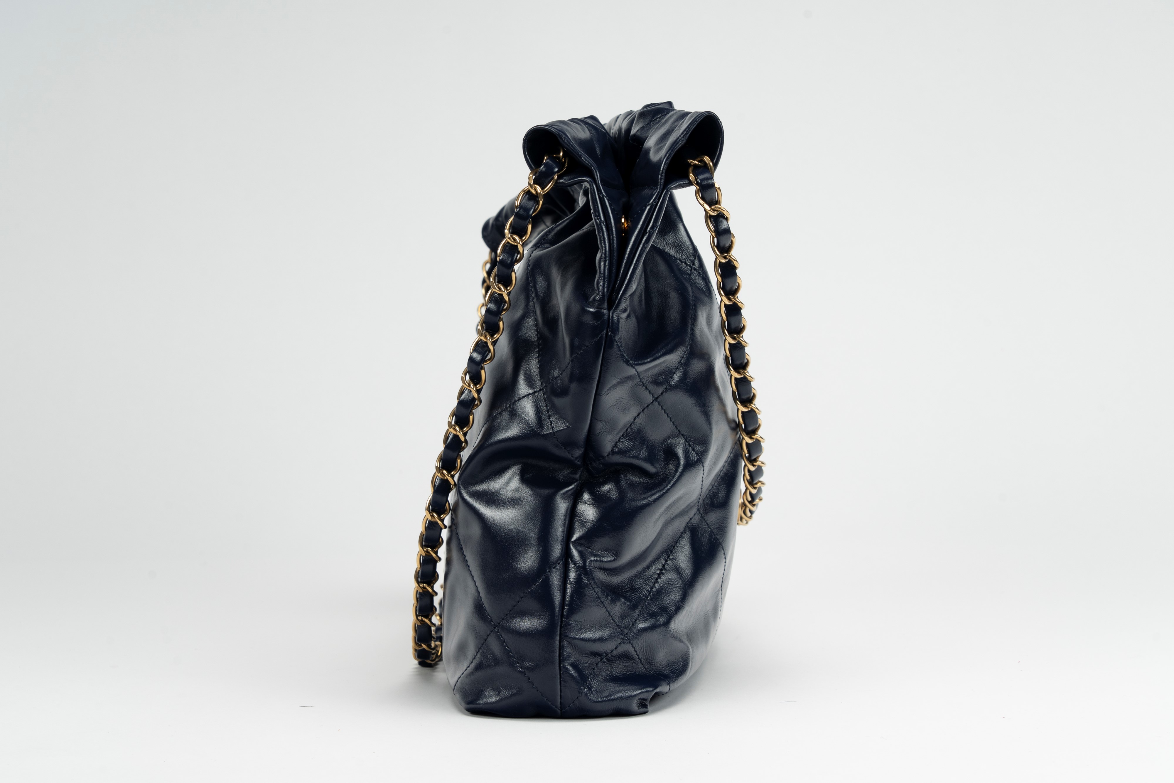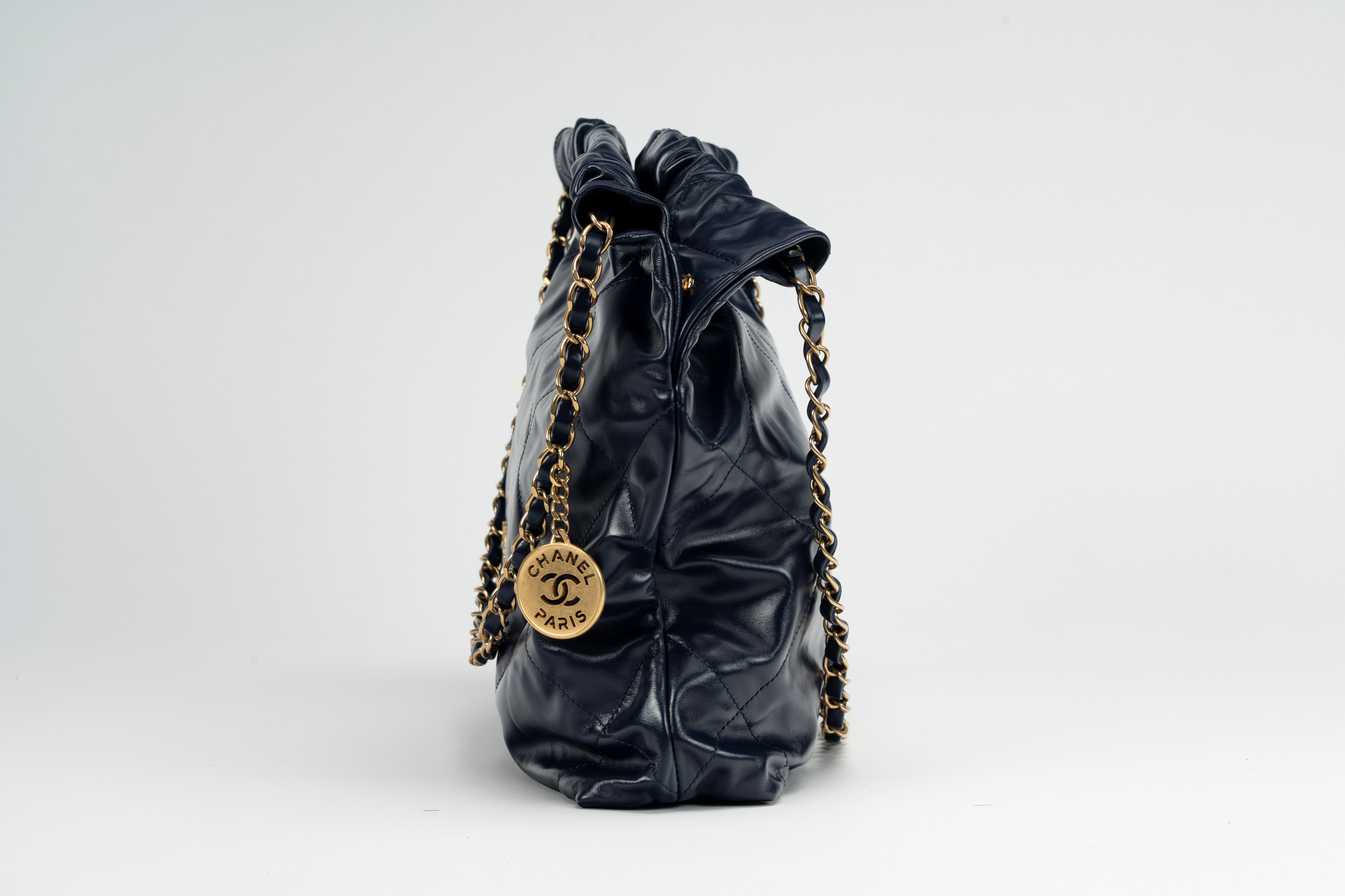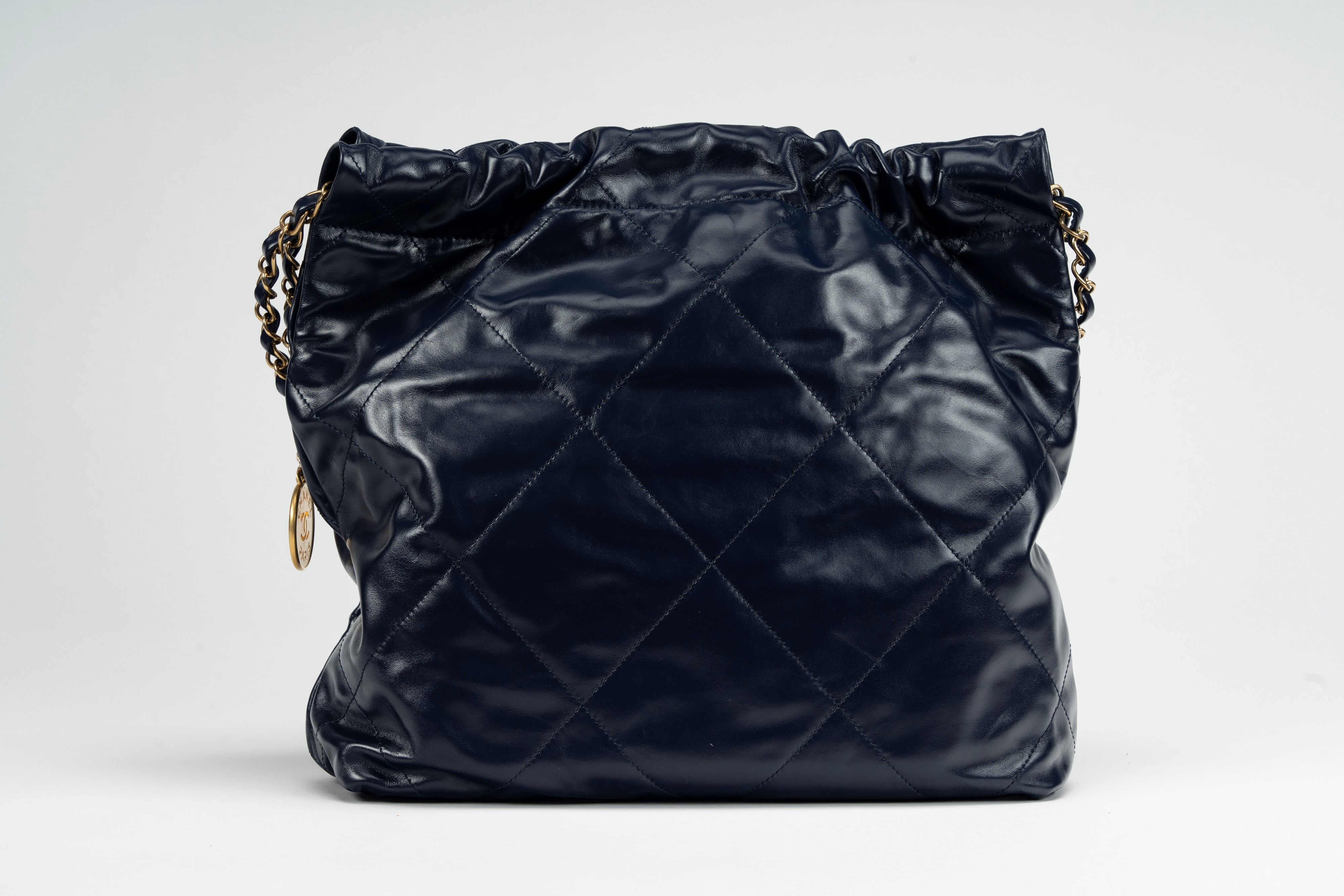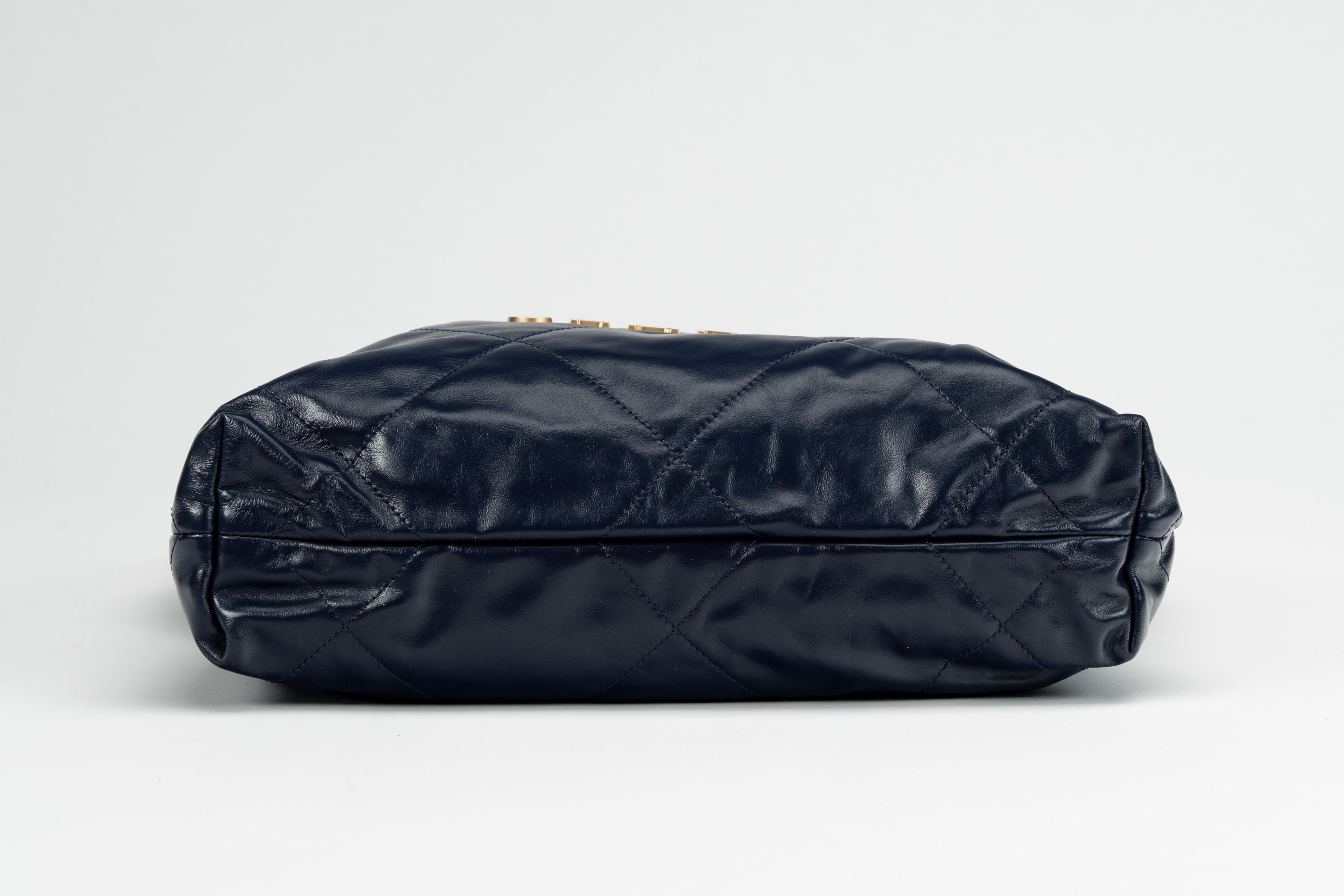 in pelle matelassé color blu, tracolla e dettagli in metallo dorato, con pouch interna staccabile, cm 30, con sacchettoBase d'asta