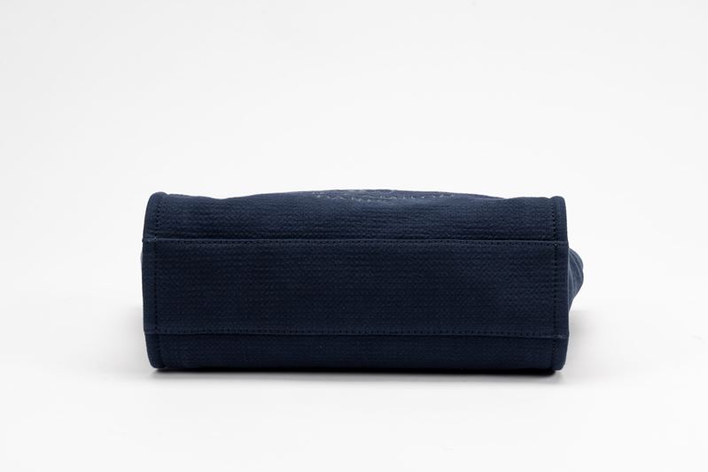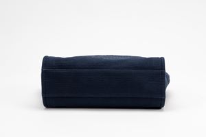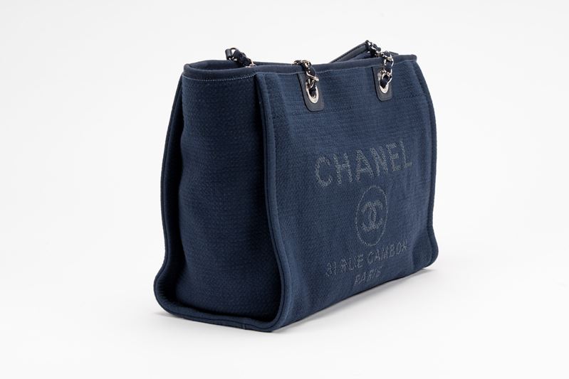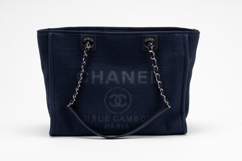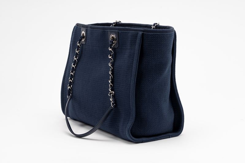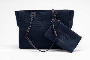 in tessuto color blu, doppia tracolla a catena in metallo e pelle, cm 34, con pouch interna, con sacchettoBase d'asta
