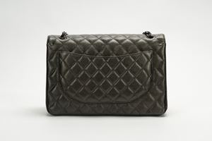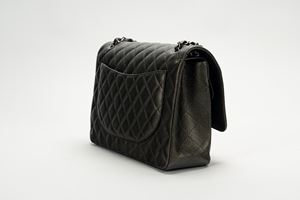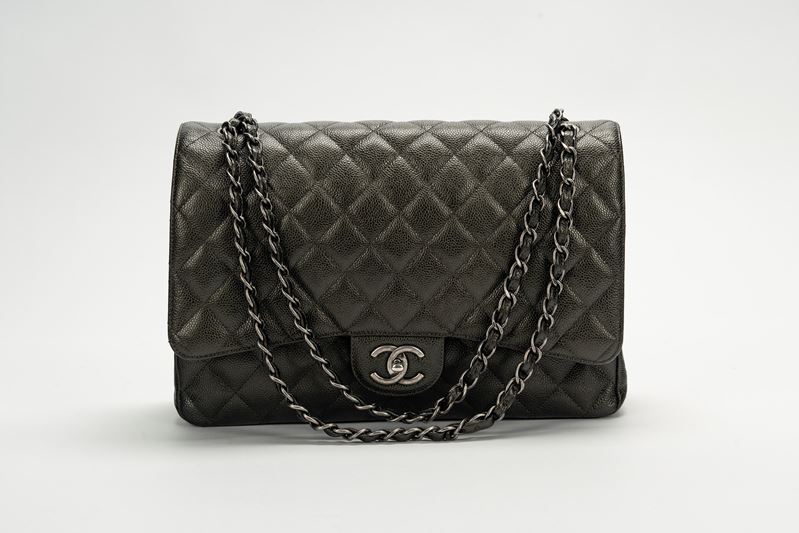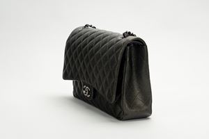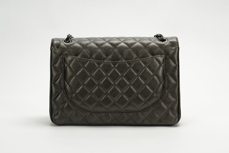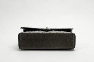2018in pelle caviar matelassé color antracite iridescente, dettagli in metallo brunito, tracolla a catena, cm 33, con scatola