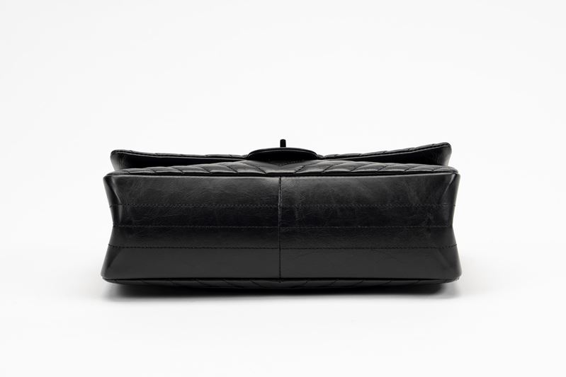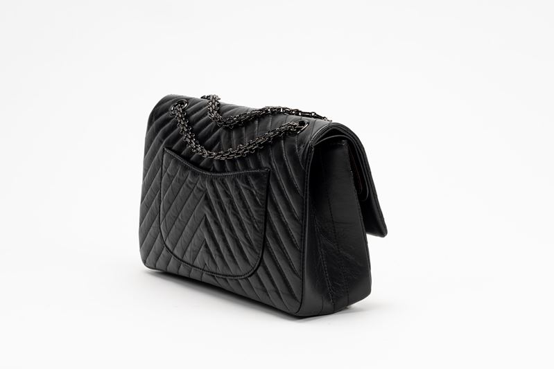 in pelle chevron color nero, dettagli in metallo smaltato, tracolla a catena, interno in pelle, color bordeaux, cm 27, con sacchetto e scatolaBase d'asta