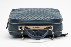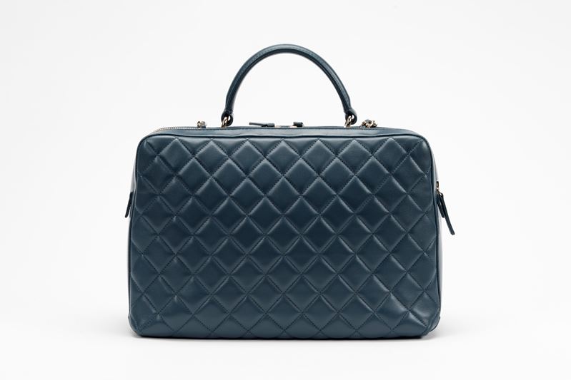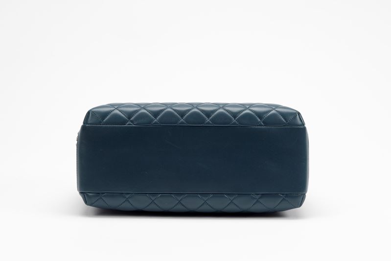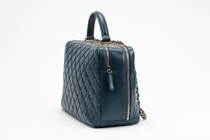 in pelle matelassé color blu, doppio scomparto interno, interno in pelle color bordeaux, dettagli in metallo dorato, manico e tracolla a catena staccabile, cm 35Base d'asta