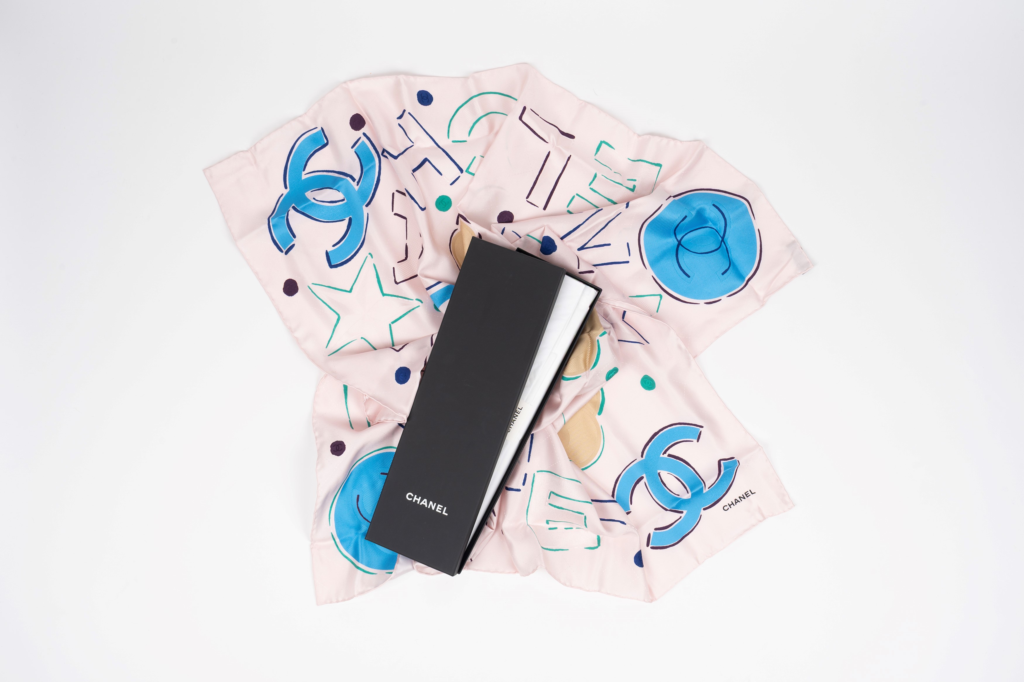 in seta su fondo color rosa chiaro con scritte multicolor Chanel e logo della MaisonBase d'asta
