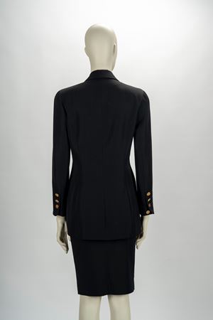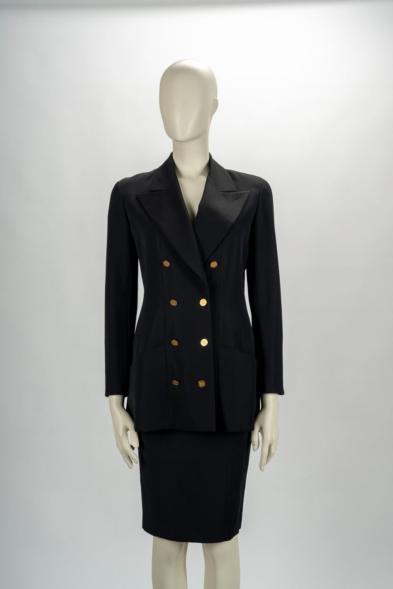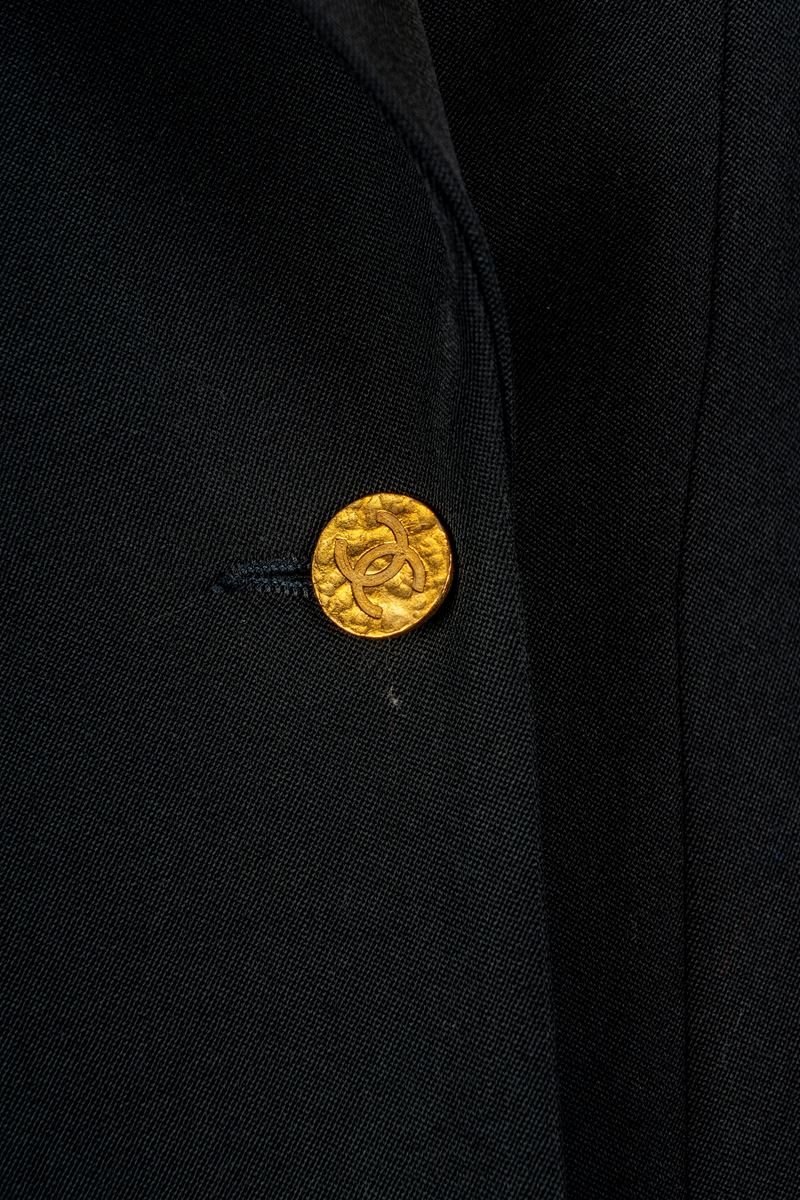 in lana color nero, manica lunga, con tasche taglio obliquo, bottoni in metallo dorato e logato, taglia non indicataGonna non inclusa