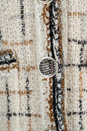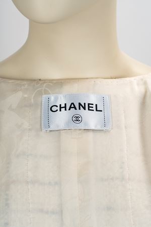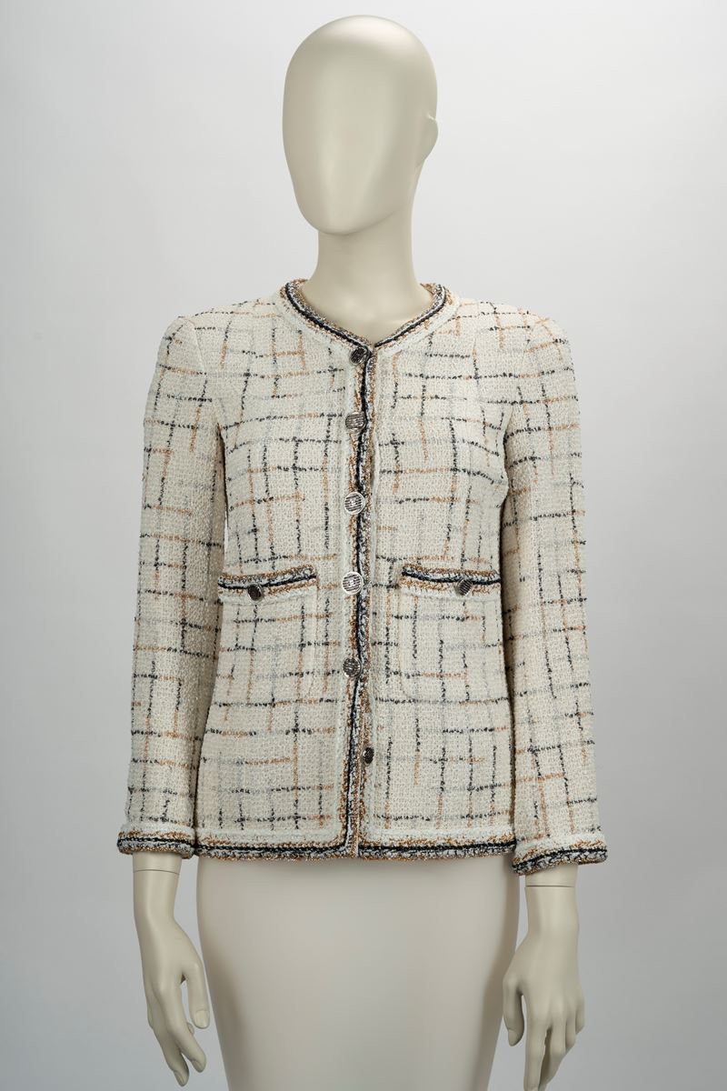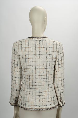 in misto lana color panna, oro e argento, bottoni logati, fodera in seta, taglia 34Base d'asta