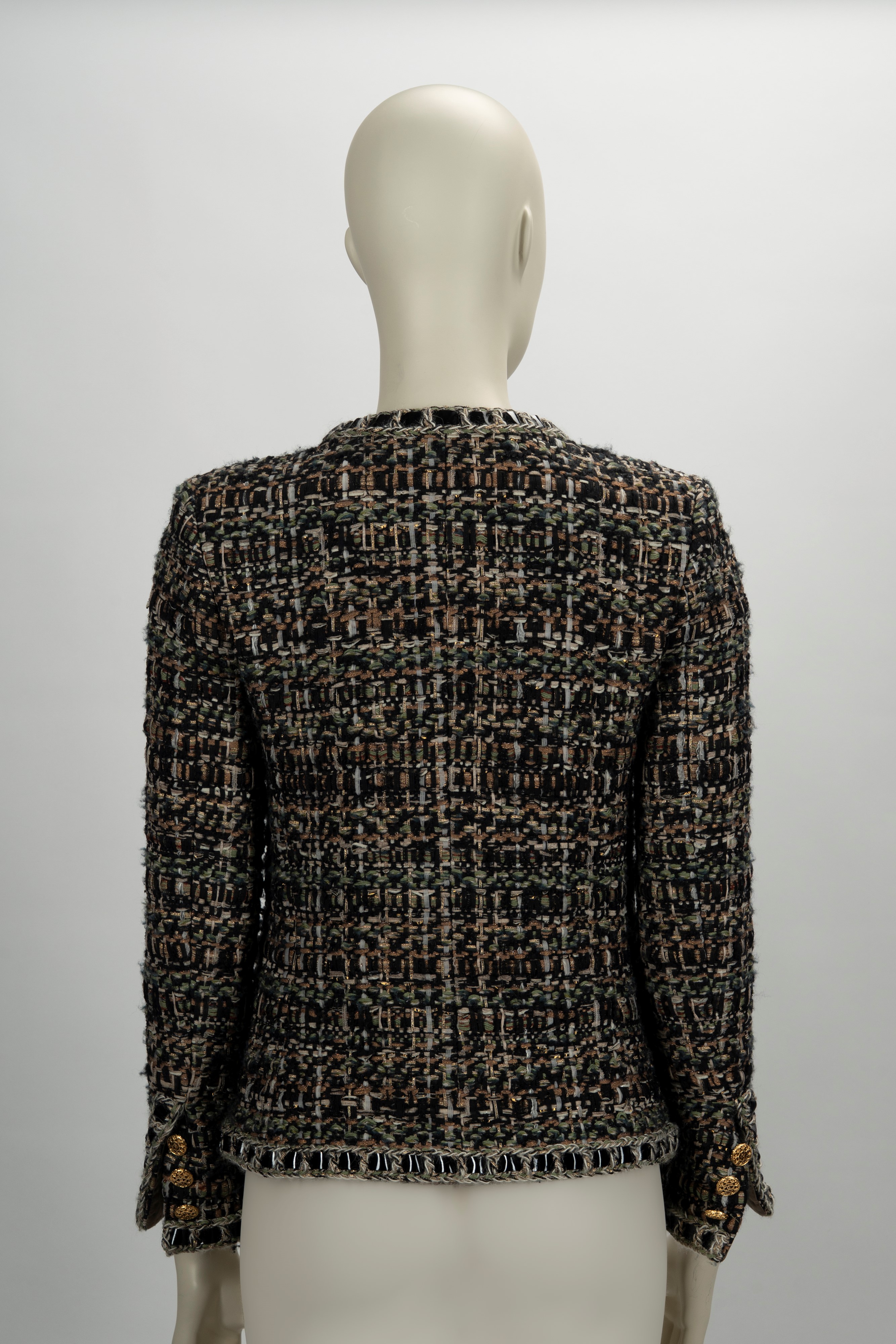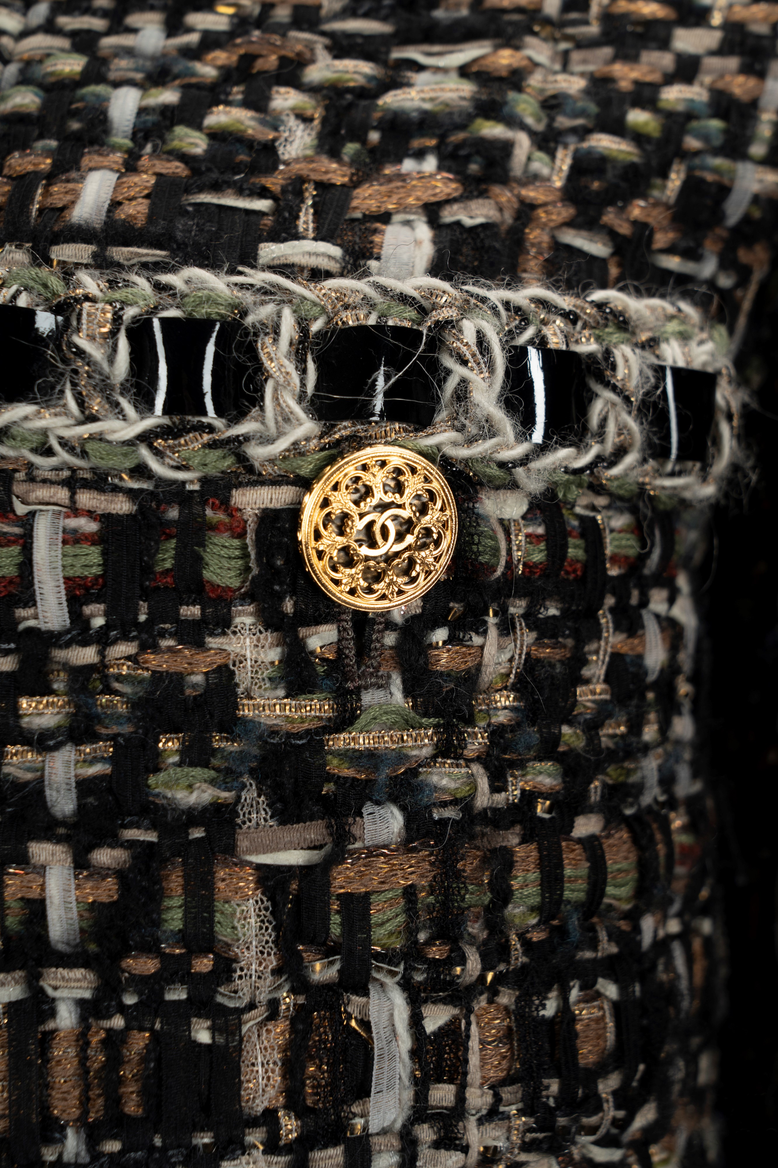 in misto lana nelle tonalità del nero, verde, beige e bianco, profili con inserti in vernice, chiusura a cerniera, bottoni in metallo dorato e logato, fodera in seta, taglia 36, con custodiaBase d'asta