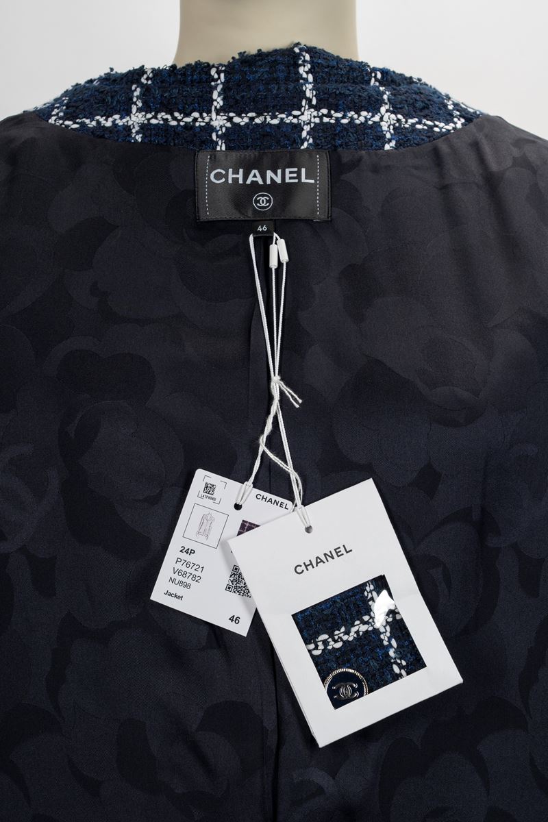 in misto cotone bouclè color blu a riquadri color bianco, bottoni in metallo logato, fodera in seta, taglia 46Base d'asta