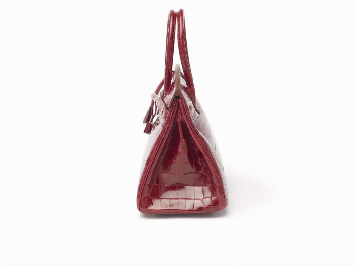 in coccodrillo Niloticus color rouge, dettagli in palladio,con sacchetto, scatola e pellicole protettive (mai usata), 2012Stima
