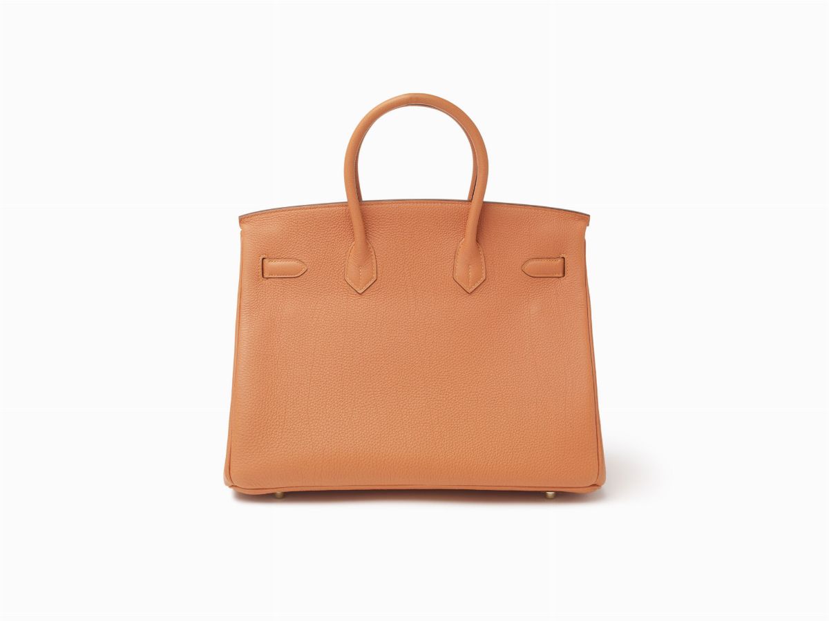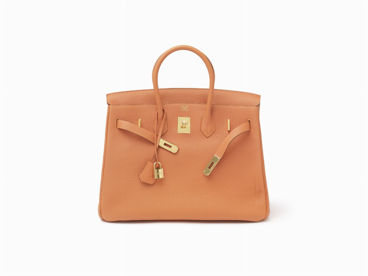 in pelle togo color arancione, dettagli in metallo dorato,con sacchetto, scatola e pellicole protettive (mai usata), 2011Stima