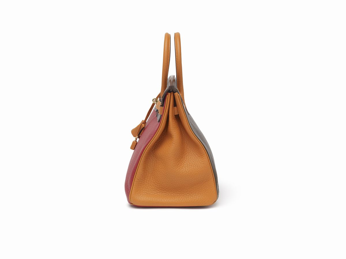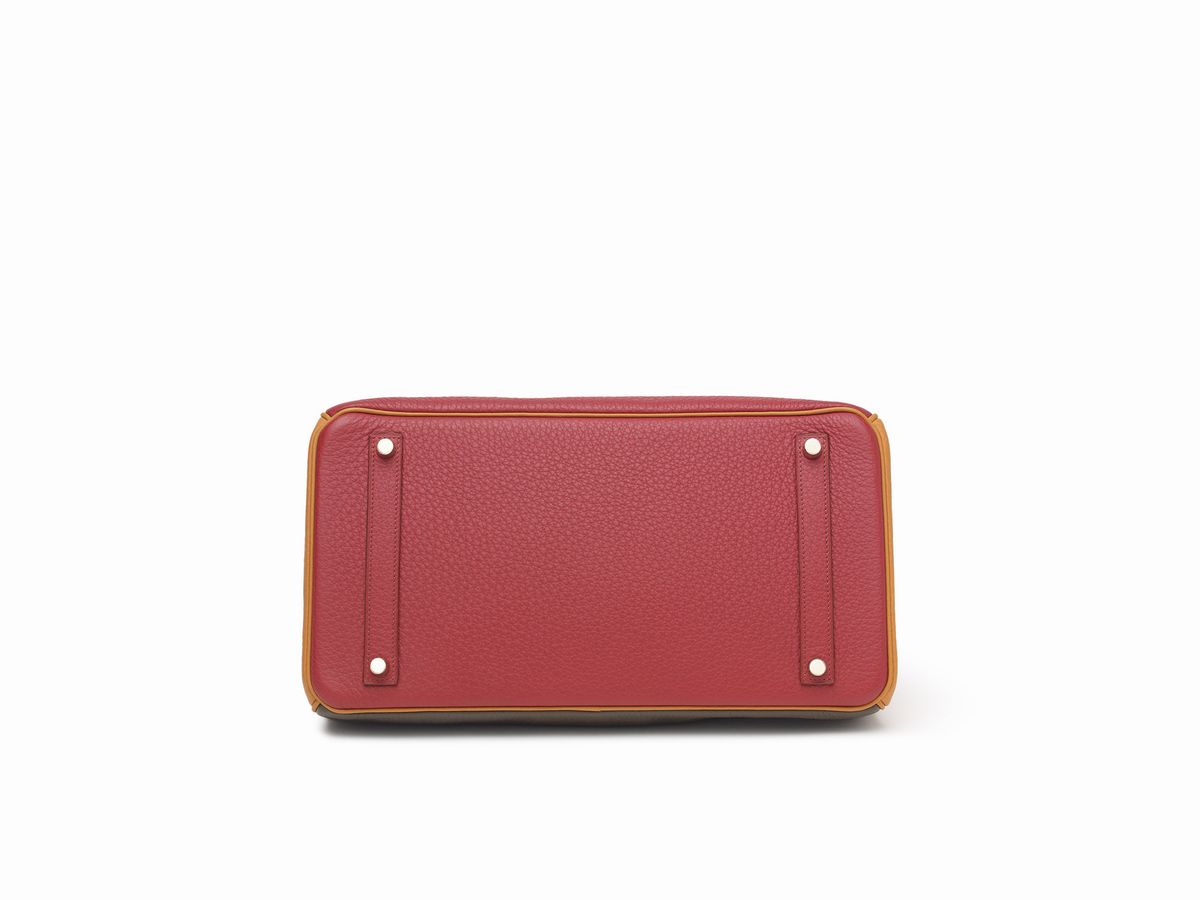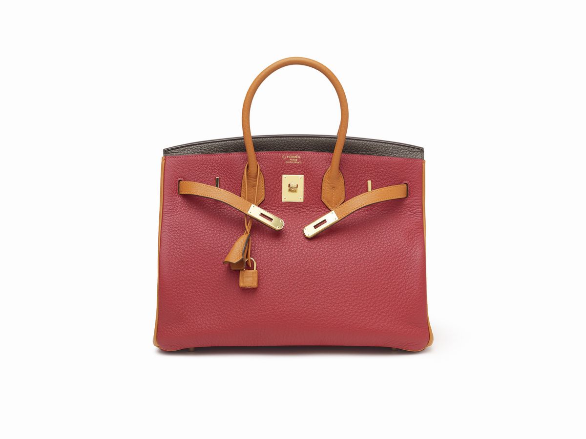in pelle taurillon clemence color rosso, caffè e arancione, dettagli in metallo dorato,con sacchetto, scatola e pellicole protettive (mai usata), ordine speciale, 2009