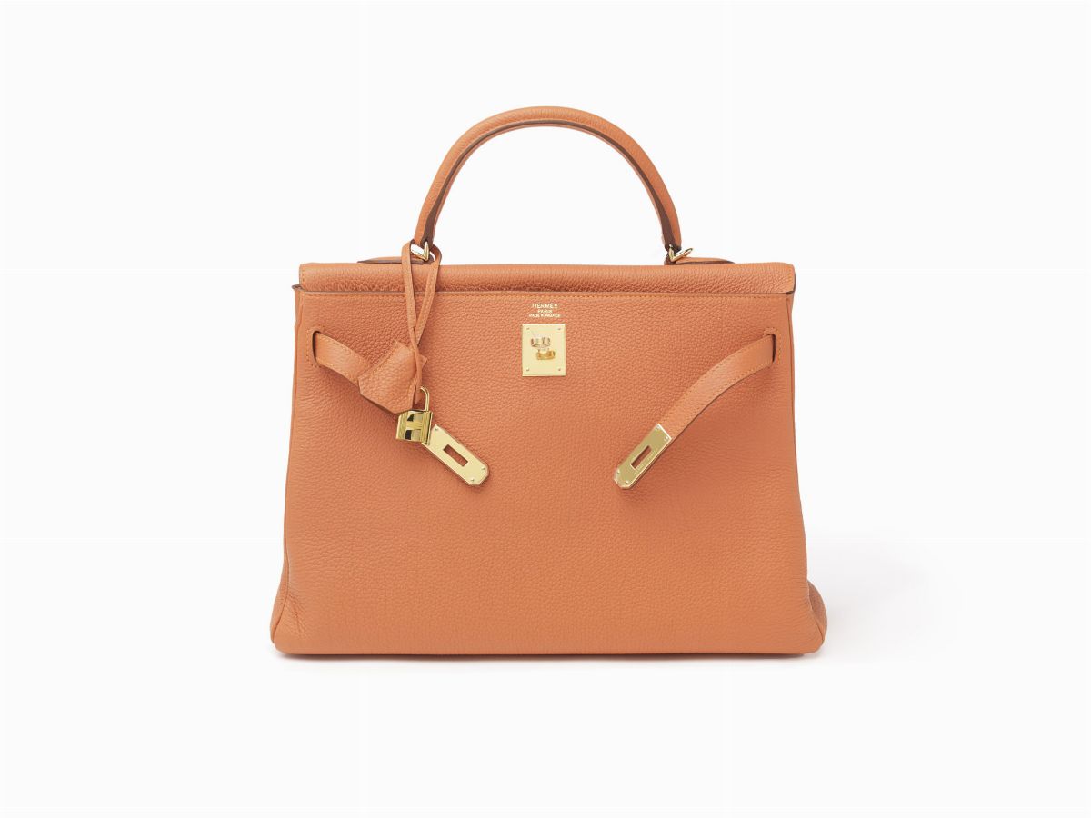 in pelle togo color arancione, dettagli in metallo dorato,con sacchetto, scatola e pellicole protettive (mai usata), 2011Stima