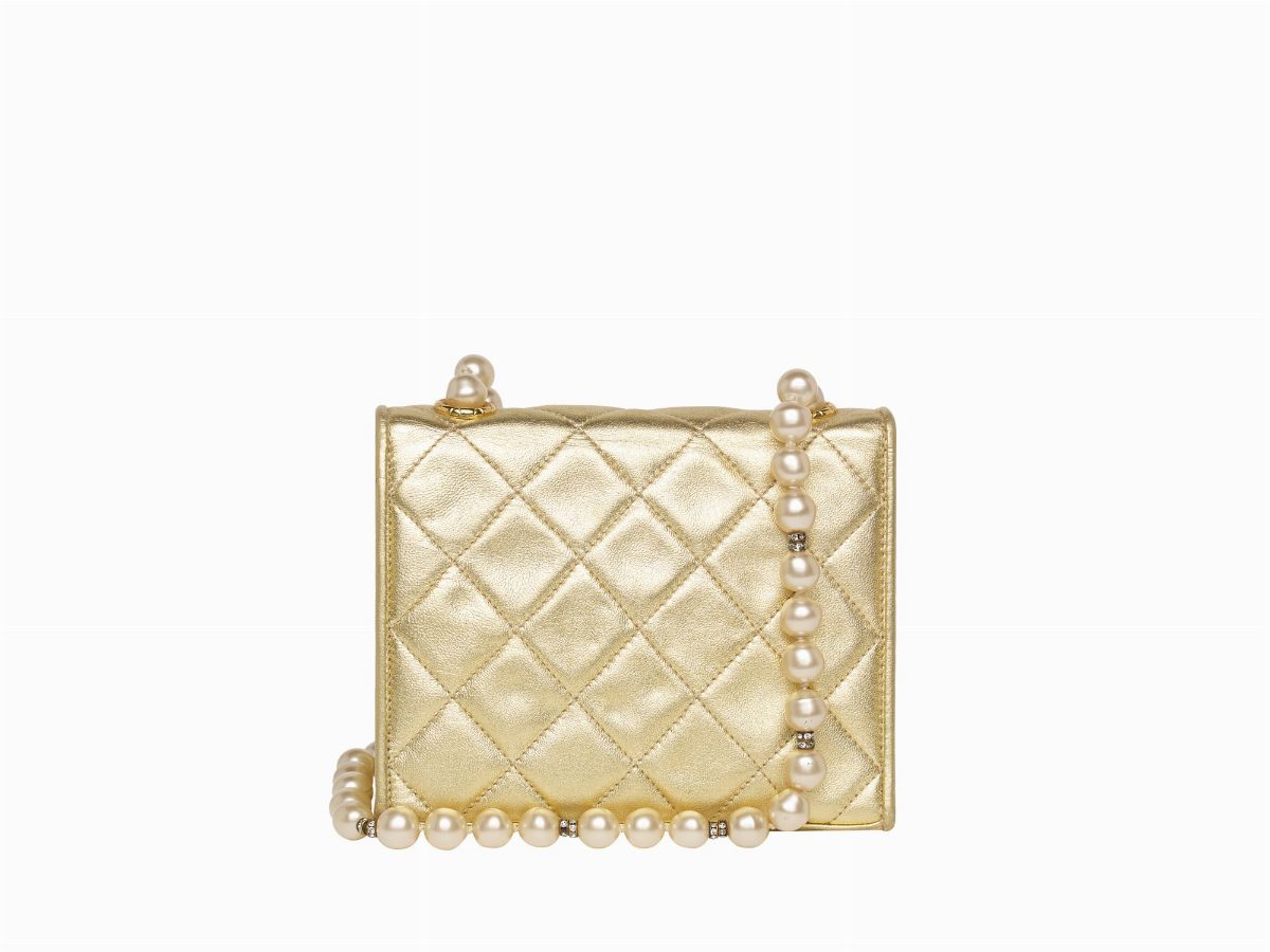 in pelle color oro, tracolla e chiusura con perle fancy e strass, cm 15, con sacchetto e scatola