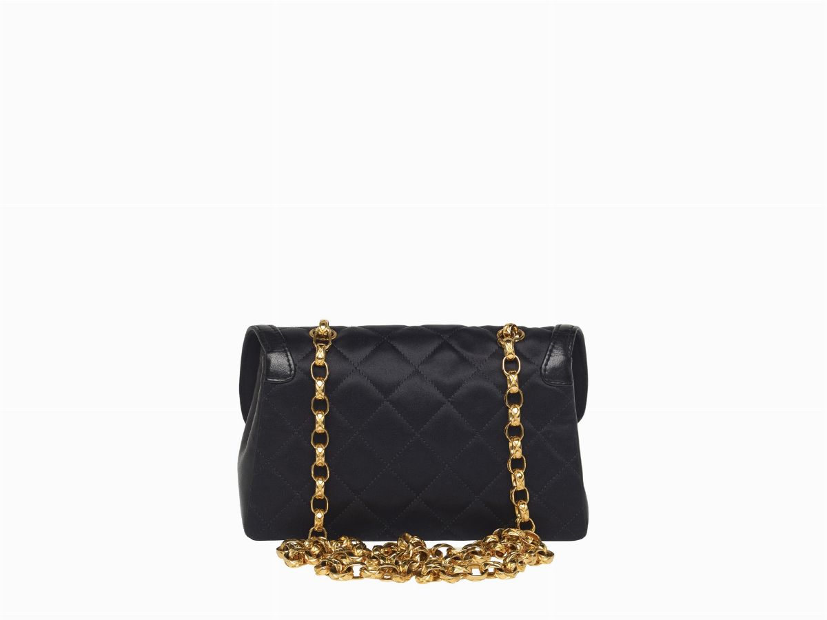 in raso trapuntato e pelle color nero, tracolla a catena e dettagli in metallo dorato, cm 19, con sacchettoStima