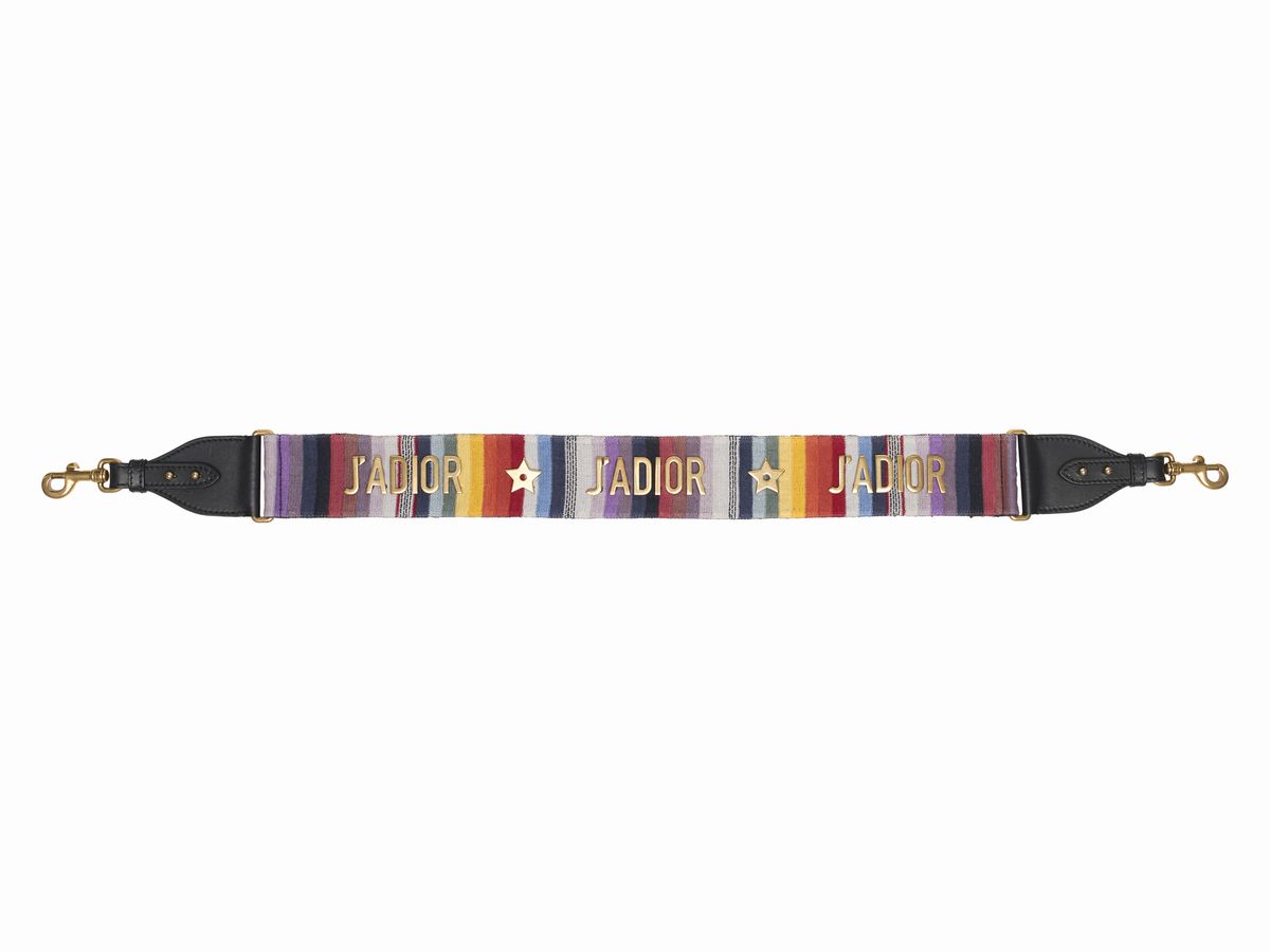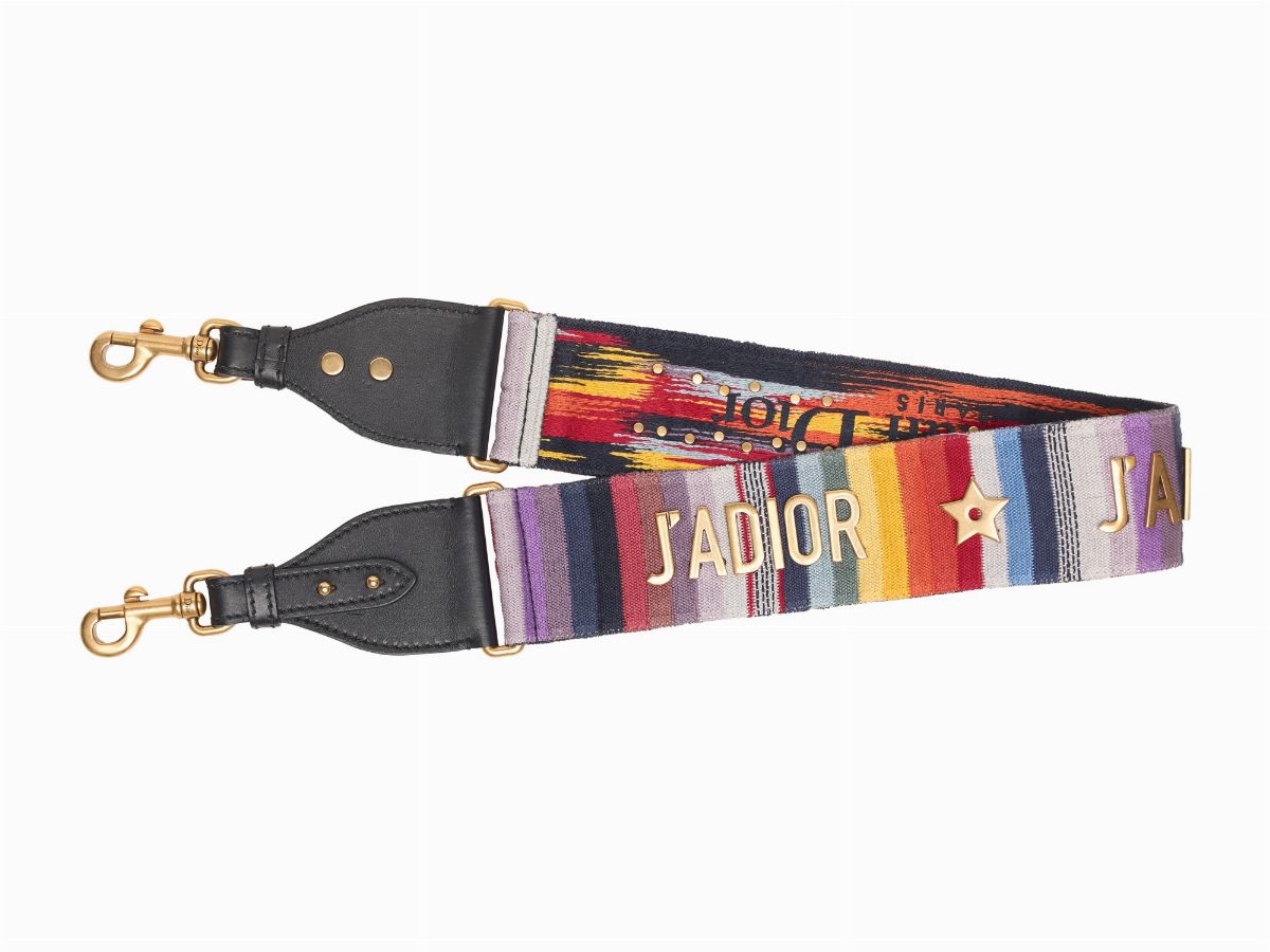 in tessuto e pelle multicolor a righe, applicazioni in metallo dorato e logato, cm 94 x 7, con sacchetto