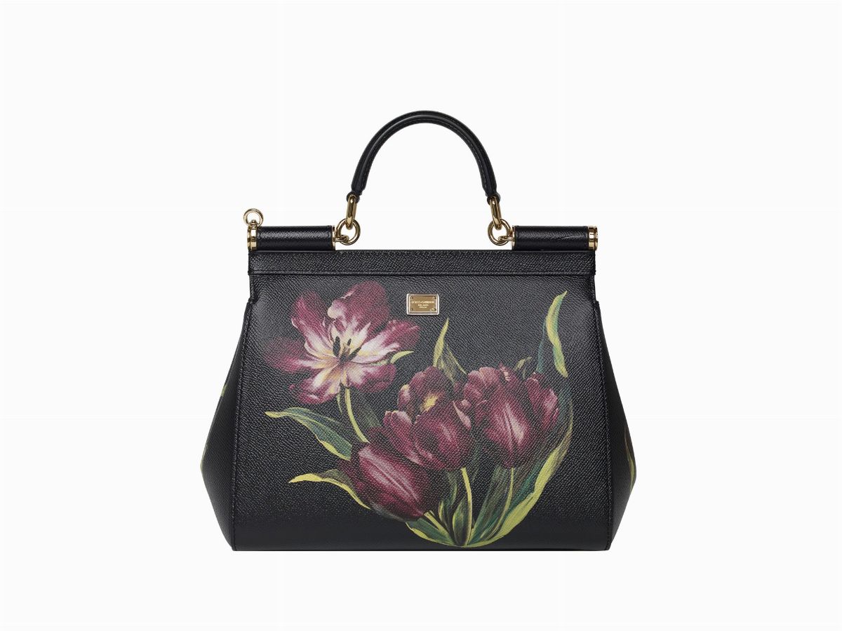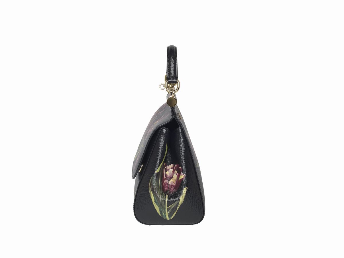 lotto composto da borsa Sicily in pelle dauphine color nero con tulipani (tracolla) e da un grand foulard in pendant, con sacchetto, cm 25Stima