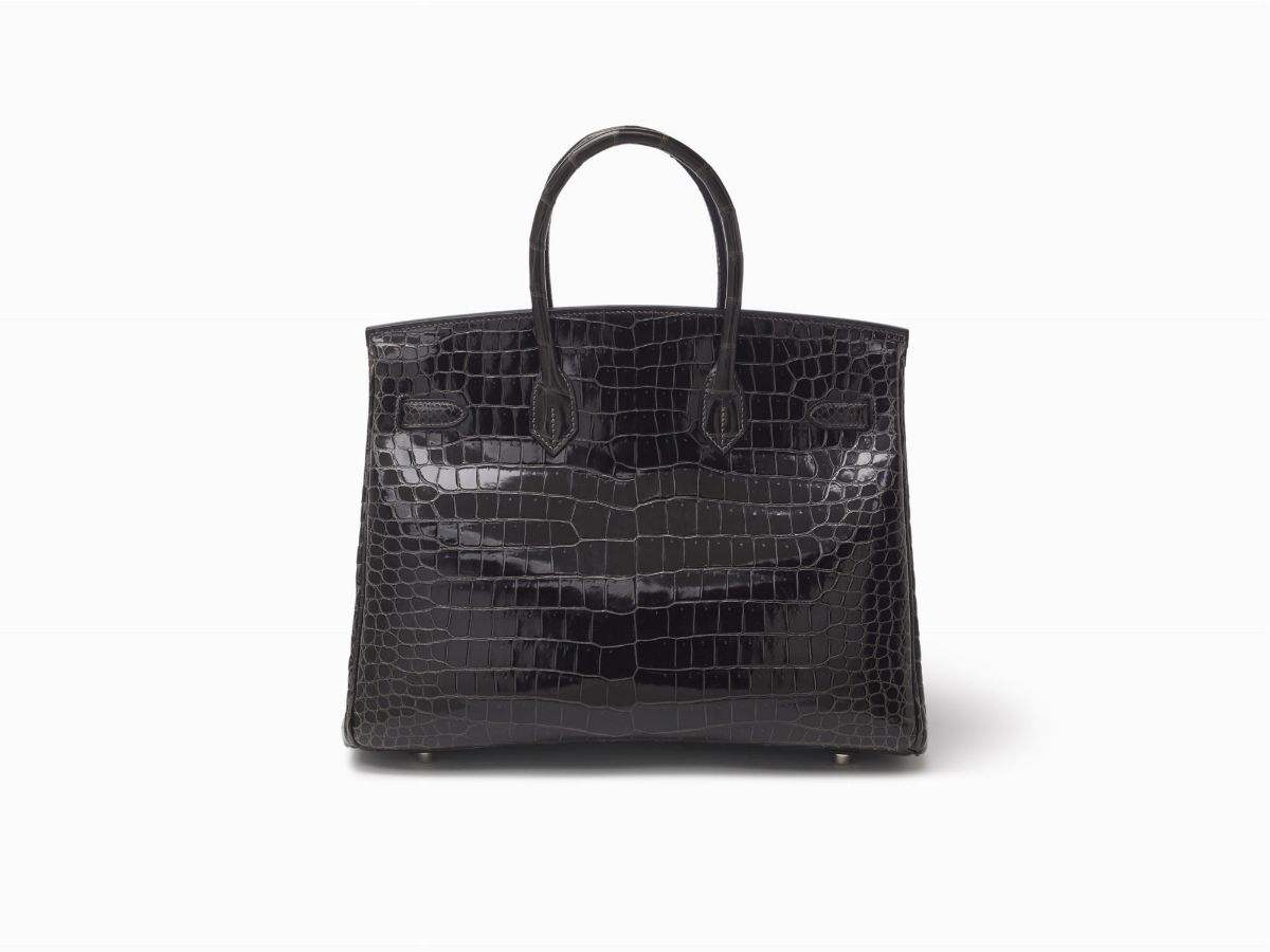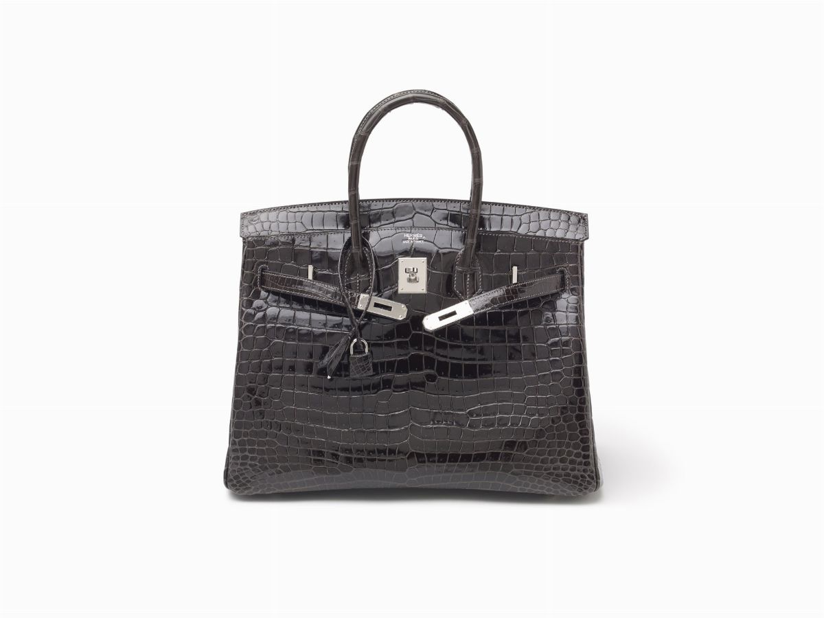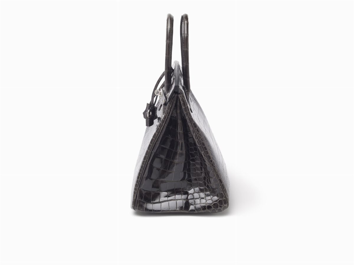 in coccodrillo Porosus color grafite, dettagli in metallo argentato, con sacchetto, scatola e pellicole protettive (mai usata)Stima
