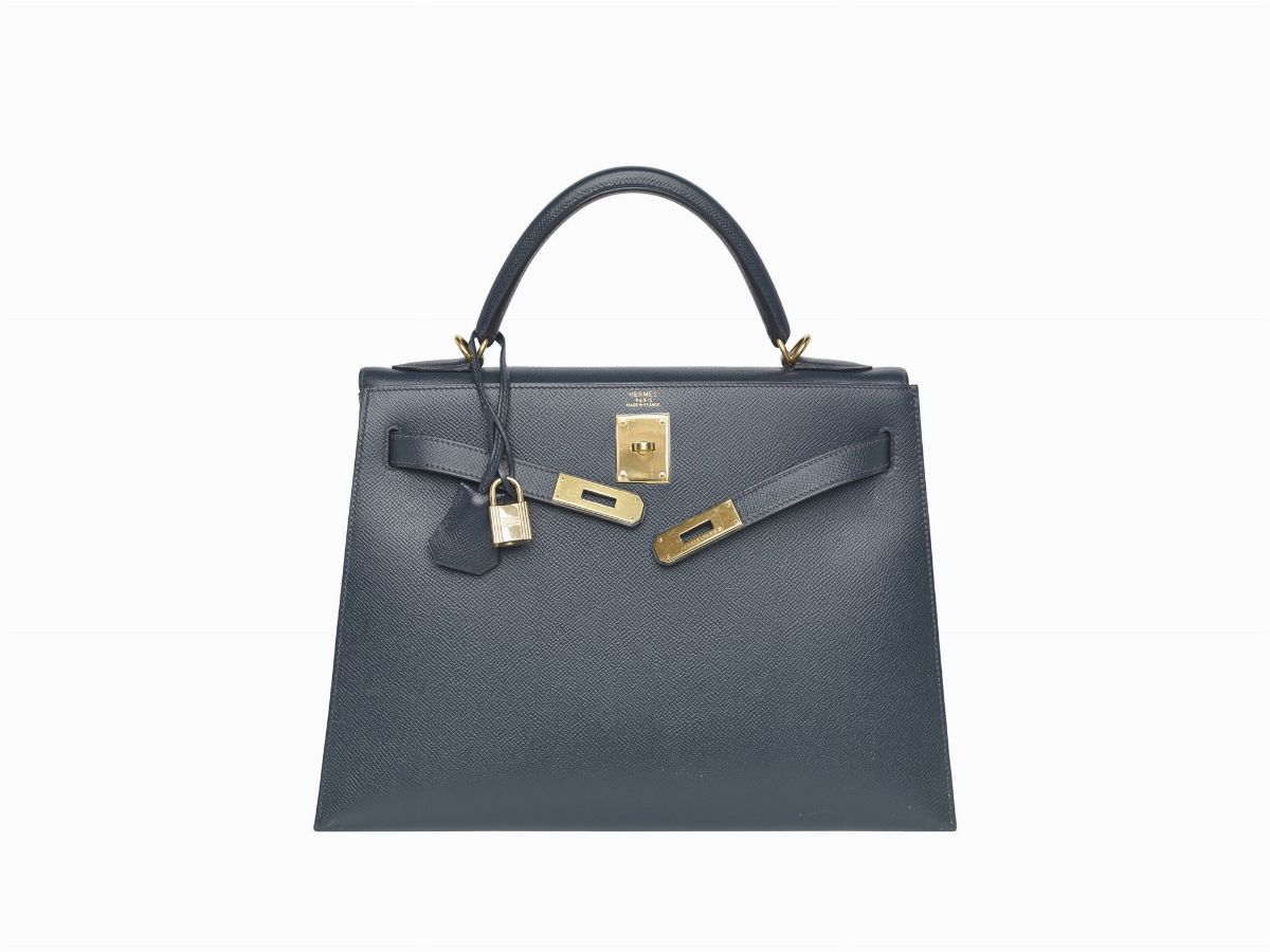 in pelle epsom color blu, dettagli in metallo dorato, con bandouliere, sacchetto e scatola (difetti)Stima