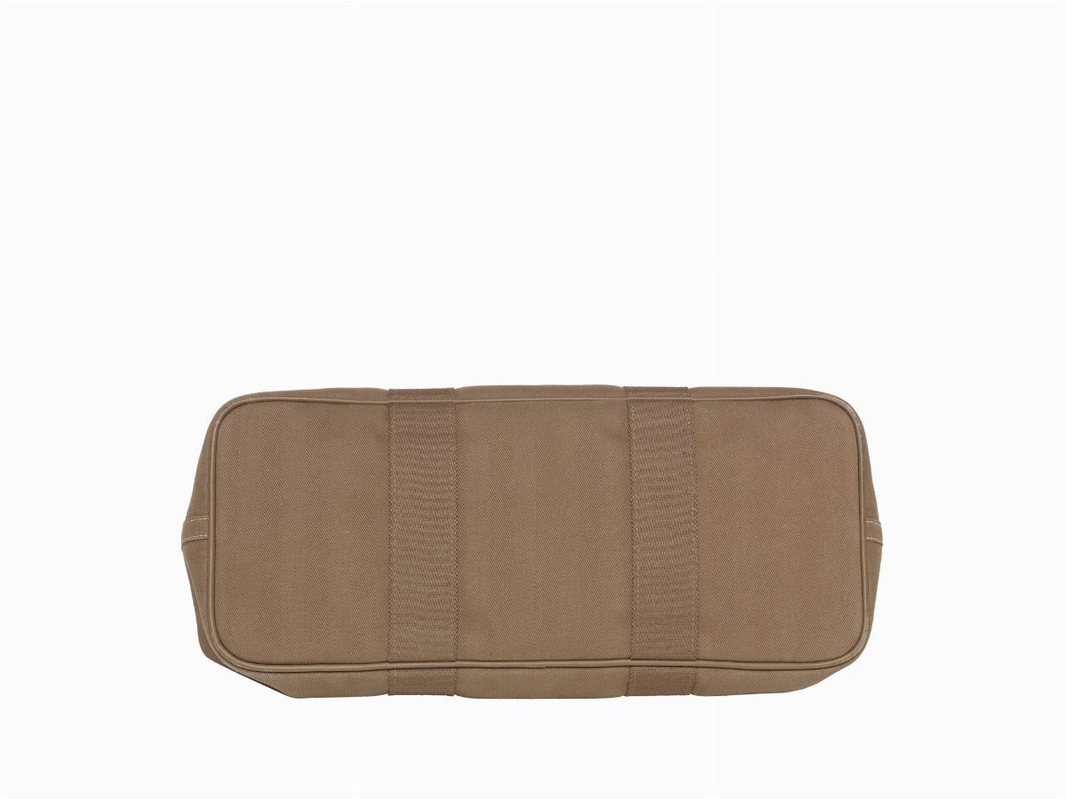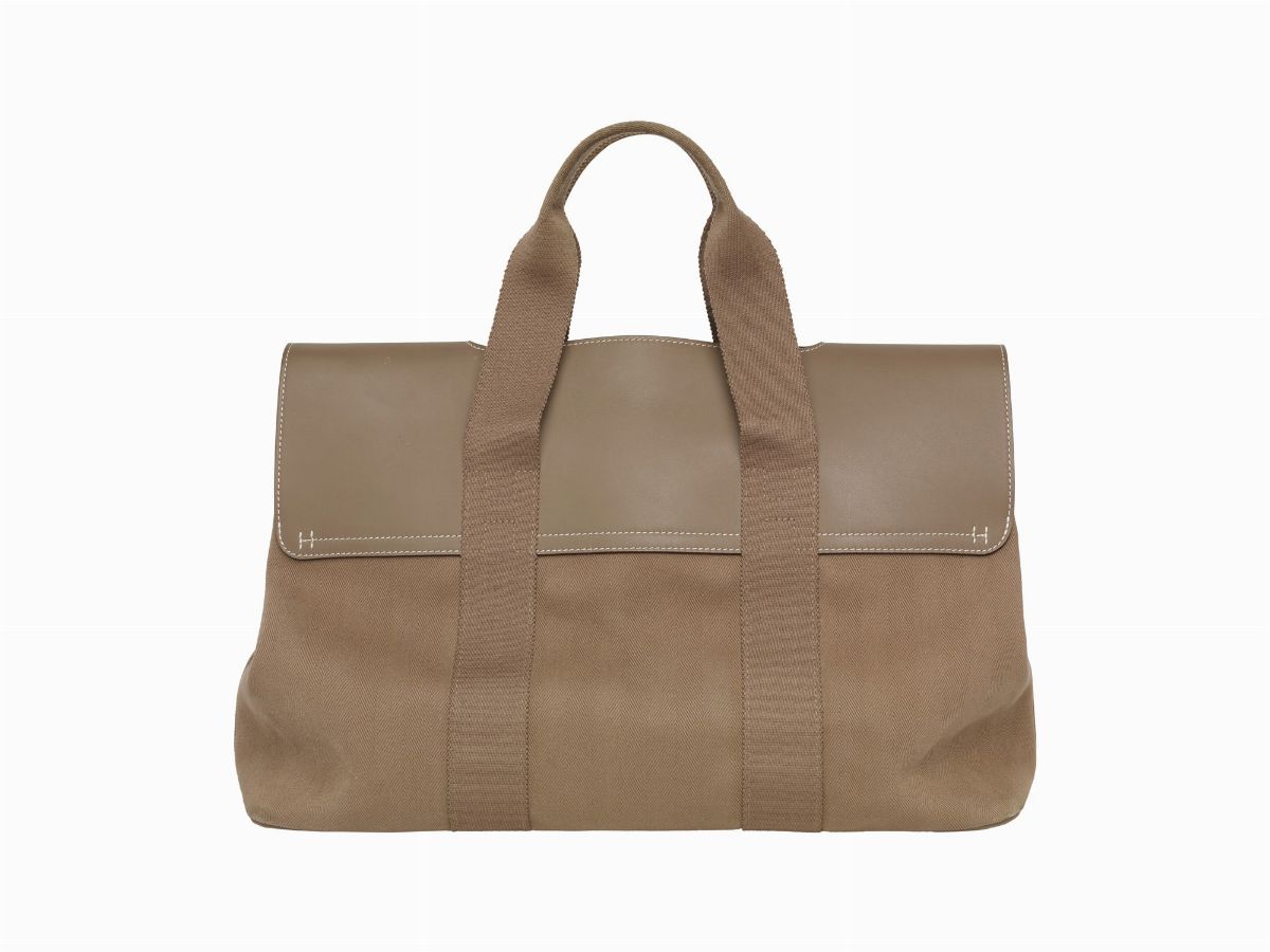 in tela color kaki e pelle, bustina interna staccabile, con sacchetto (lievi difetti)Stima
