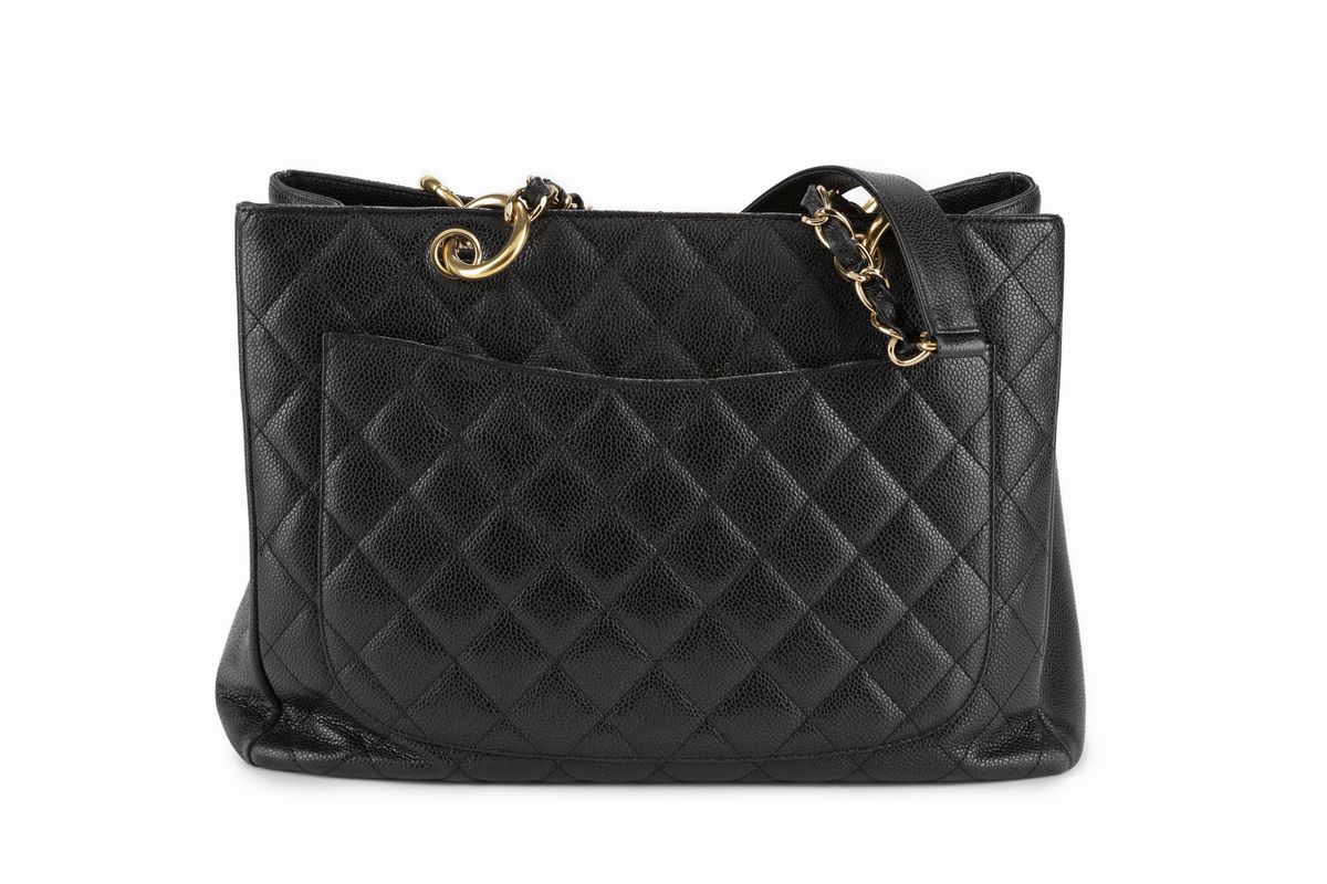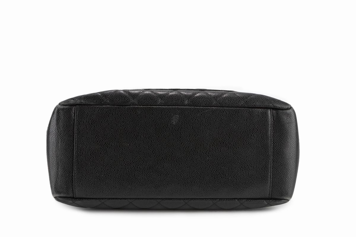 a spalla in pelle caviar matelassé color nero, doppi manici a catena, dettagli dorati, cm 33, con sacchetto (difetti).Stima