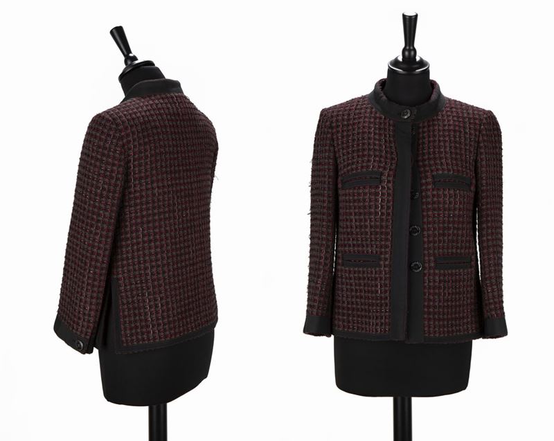in misto lana bouclé color verde, nero e bordeaux, profili in gros grain color nero, fodera in seta, bottoni logati, tg 38.Stima