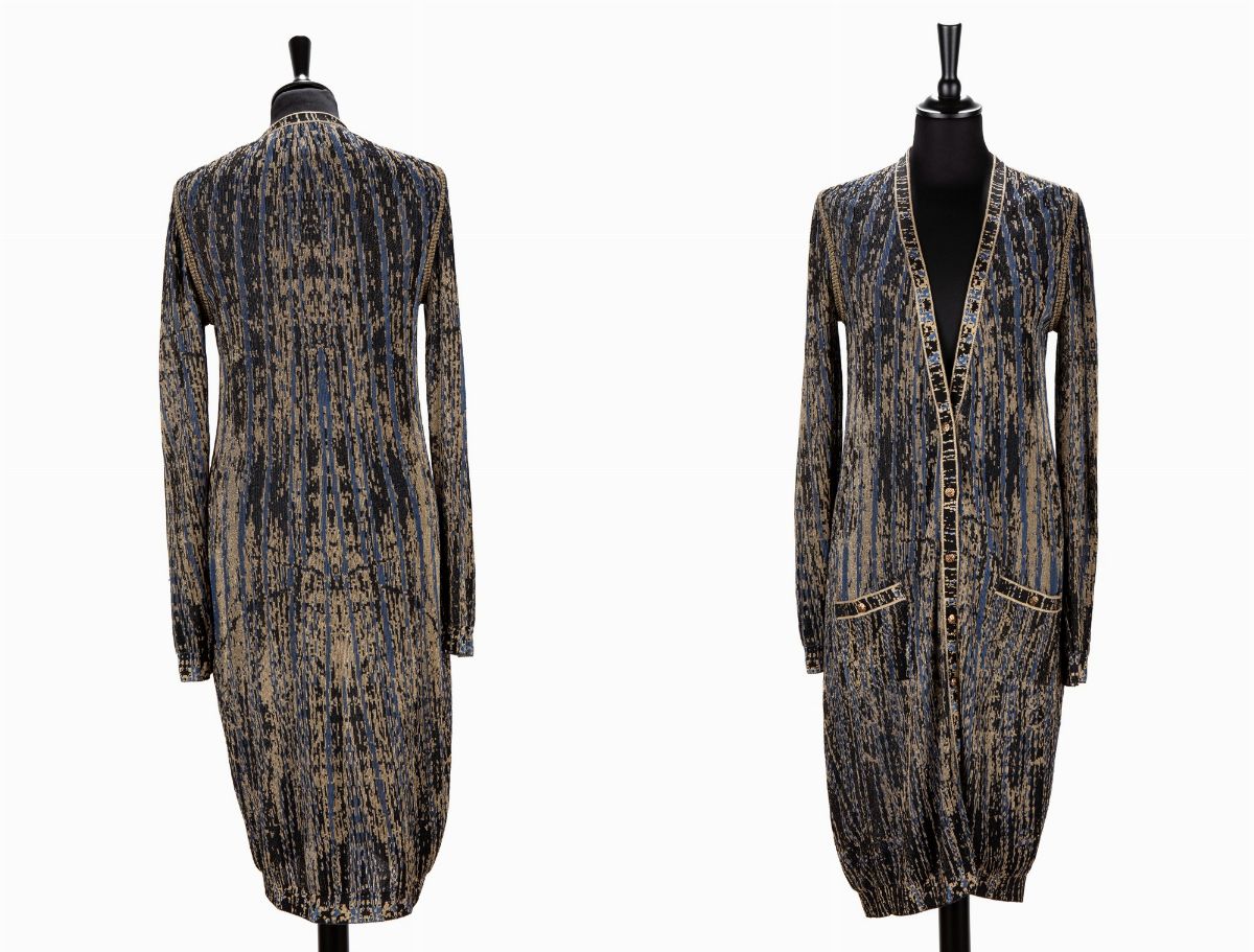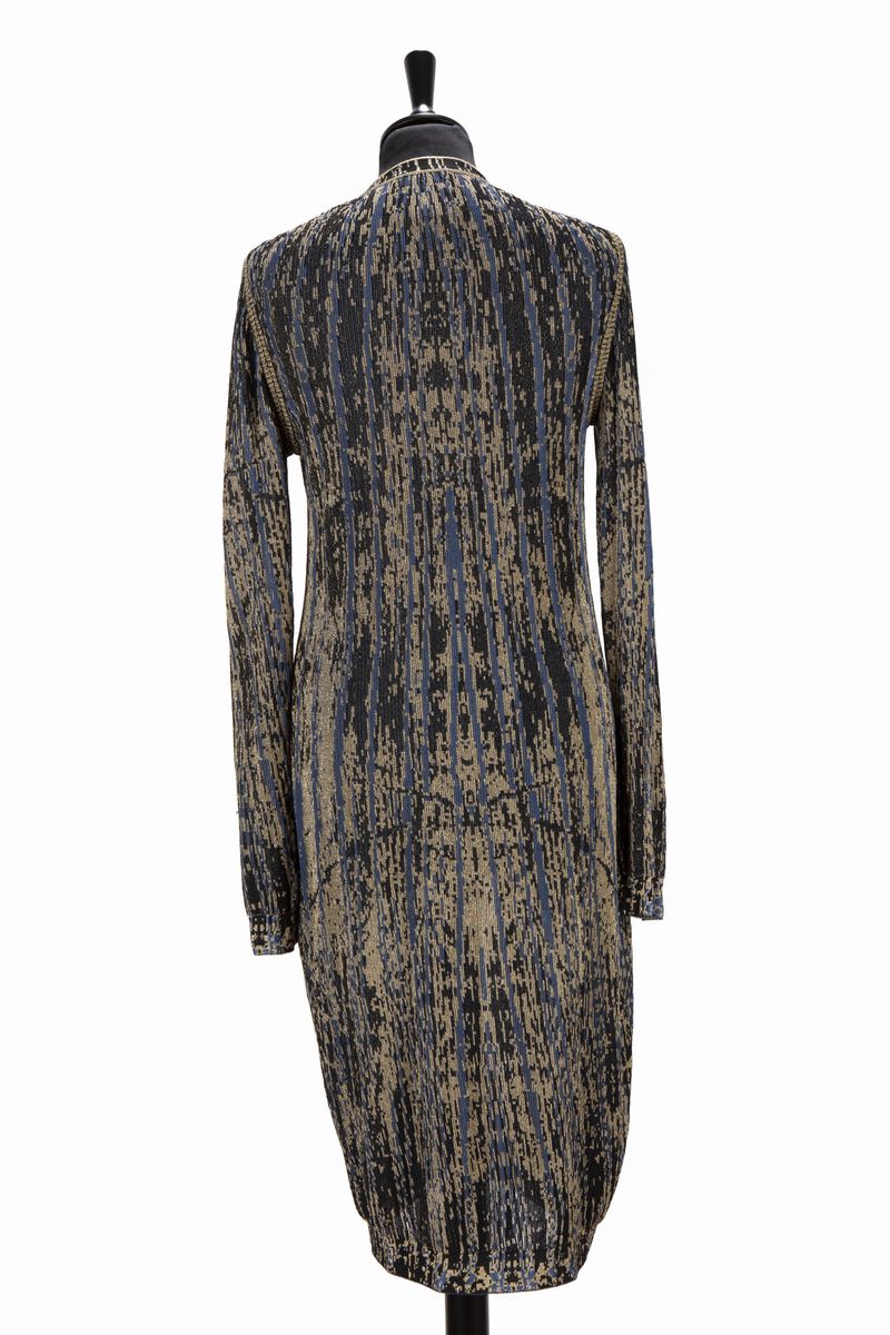 in tessuto di maglina elasticizzata color oro, blu e nero, manica lunga, chiusura con bottoni gioiello, tg 38.Stima