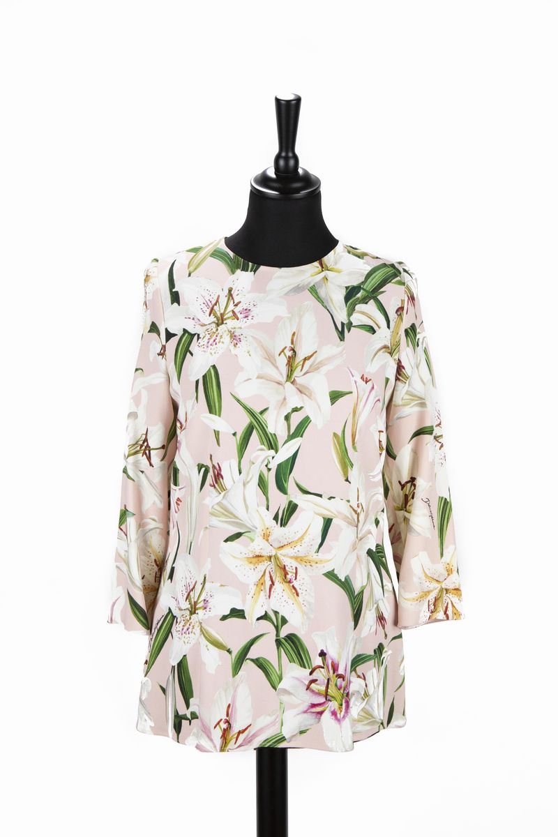 in crèpe di seta stampa floreale su fondo color rosa, tg 44, con custodia.Stima