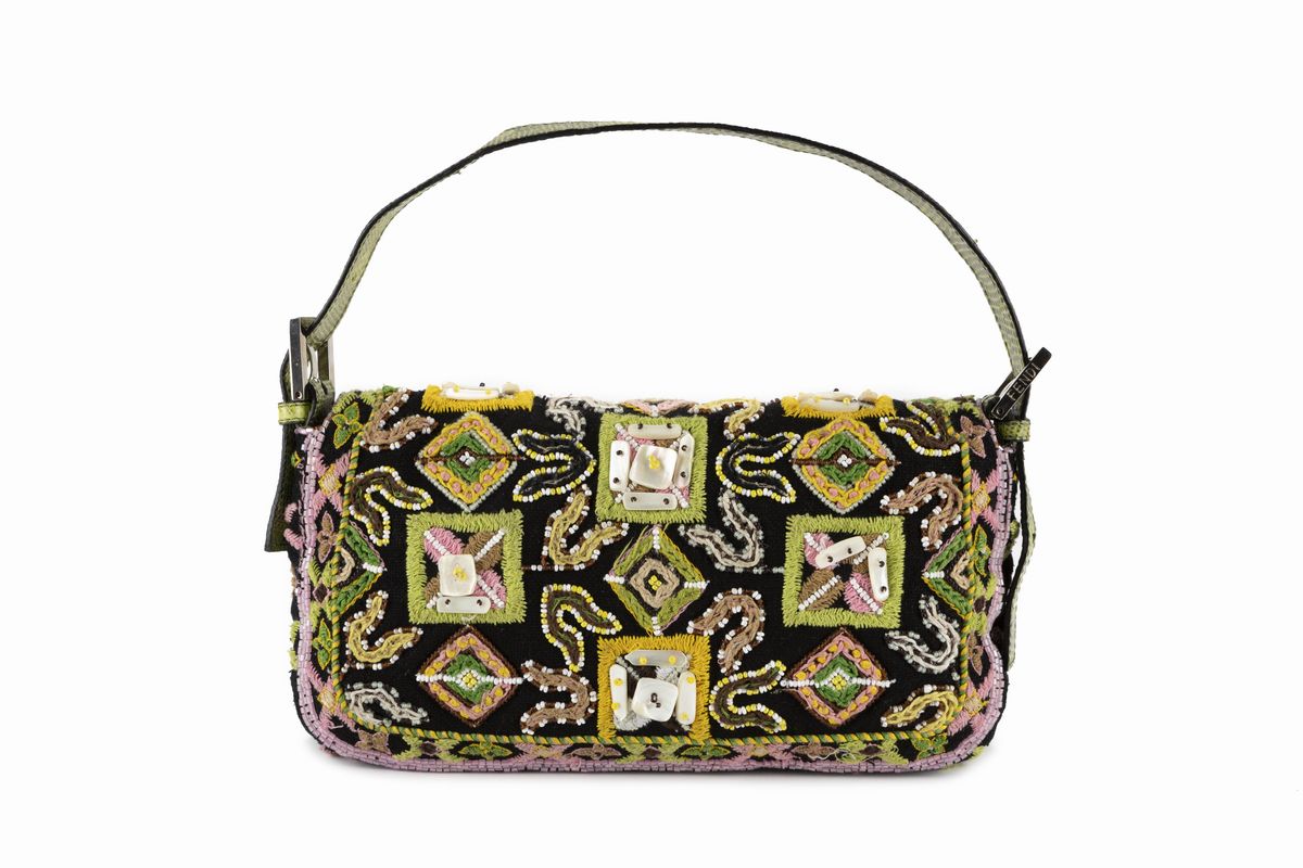 in tessuto color nero ricamato con applicazioni di perline in vetro multicolor, tracolla e chiusura in pitone, cm 25, edizione limitata, con sacchetto (lievi difetti e mancanze).Stima