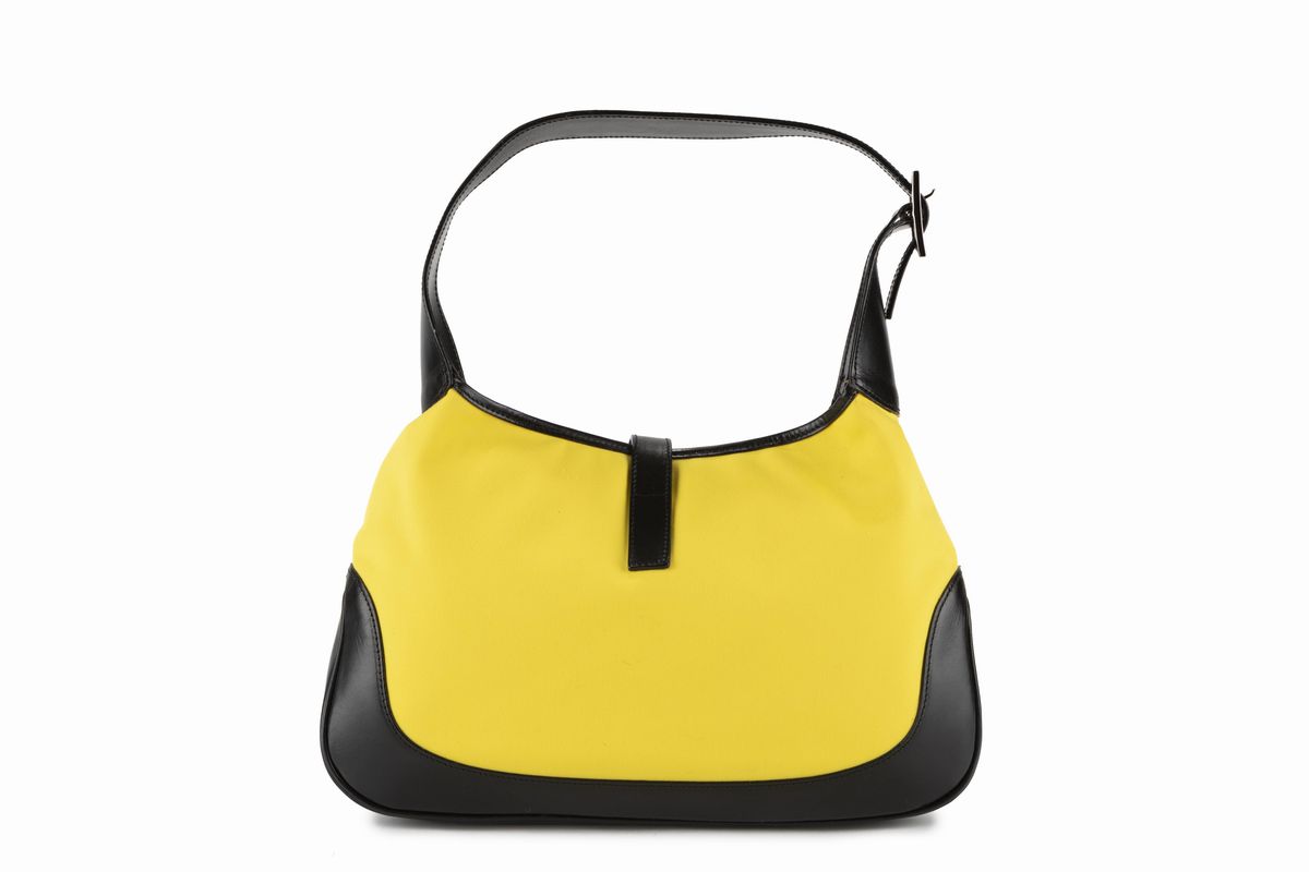 in tessuto color giallo limone, finiture e tracolla in pelle color nero, cm 32 (lievi difetti).Stima