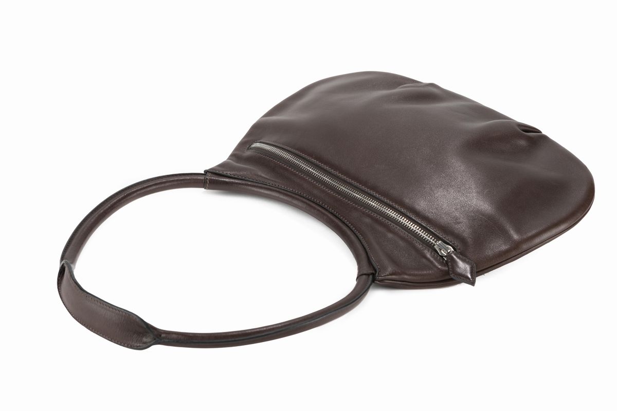 a tracolla stondata in pelle color testa di moro, cm 35, con sacchetto.
