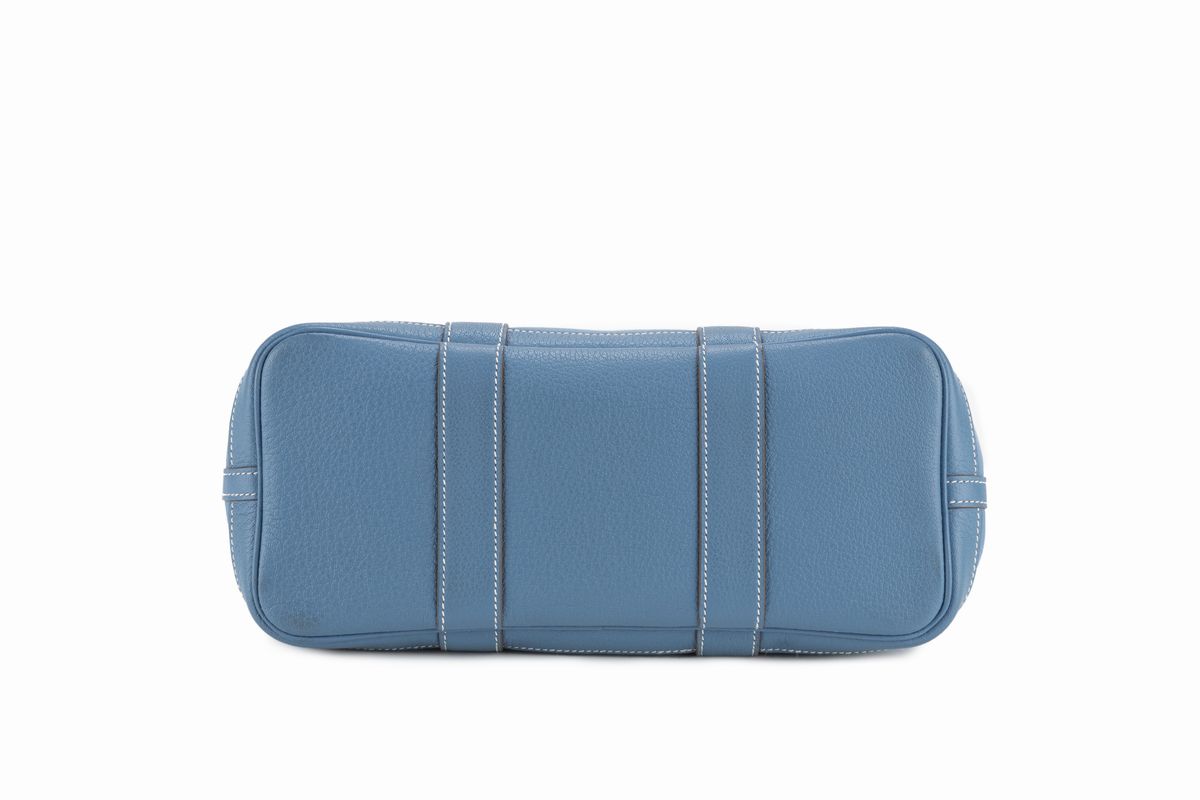 in tela color bleu tourterelle con finiture in pelle, cm 30, con sacchetto (difetti).