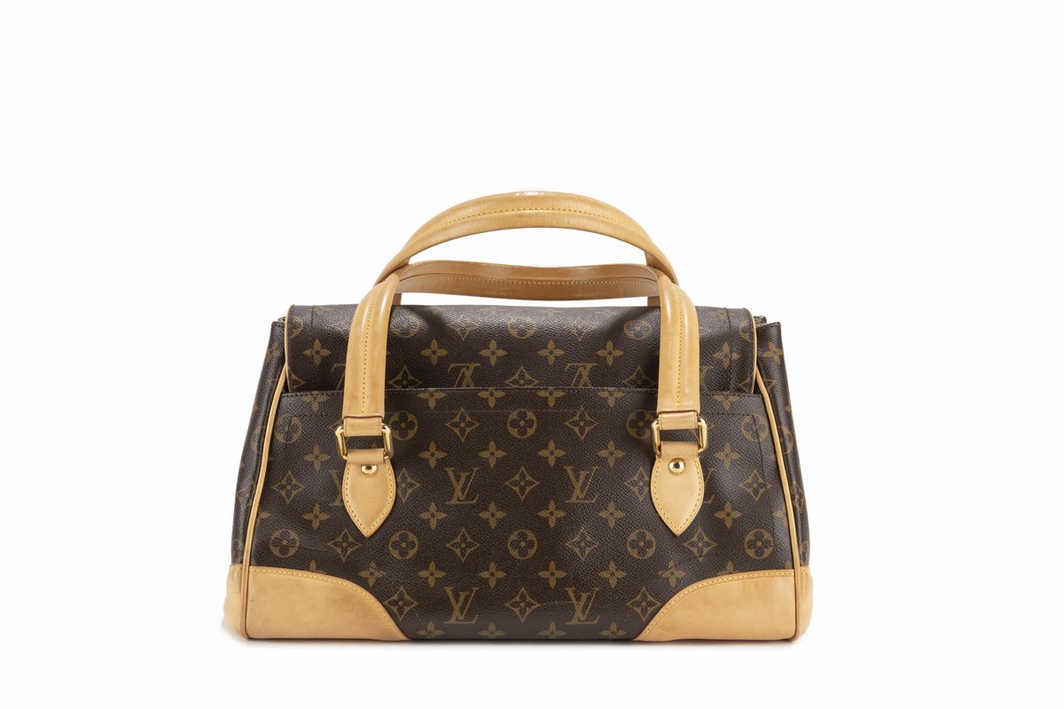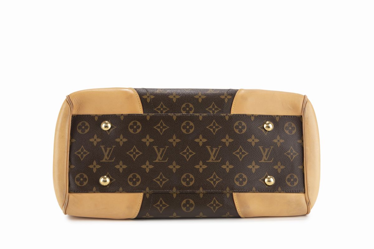 in tela monogram, doppi manici e angoli in vacchetta, dettagli in metallo dorato, cm 37 (difetti).Stima