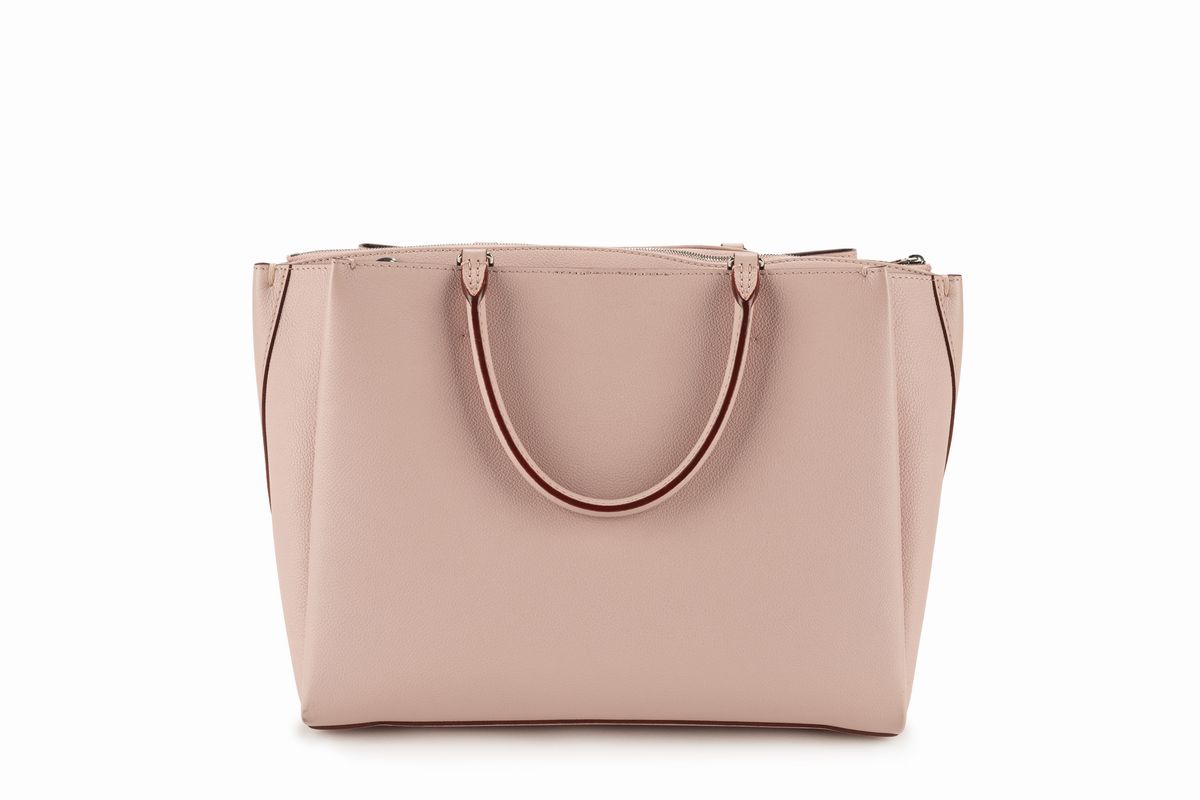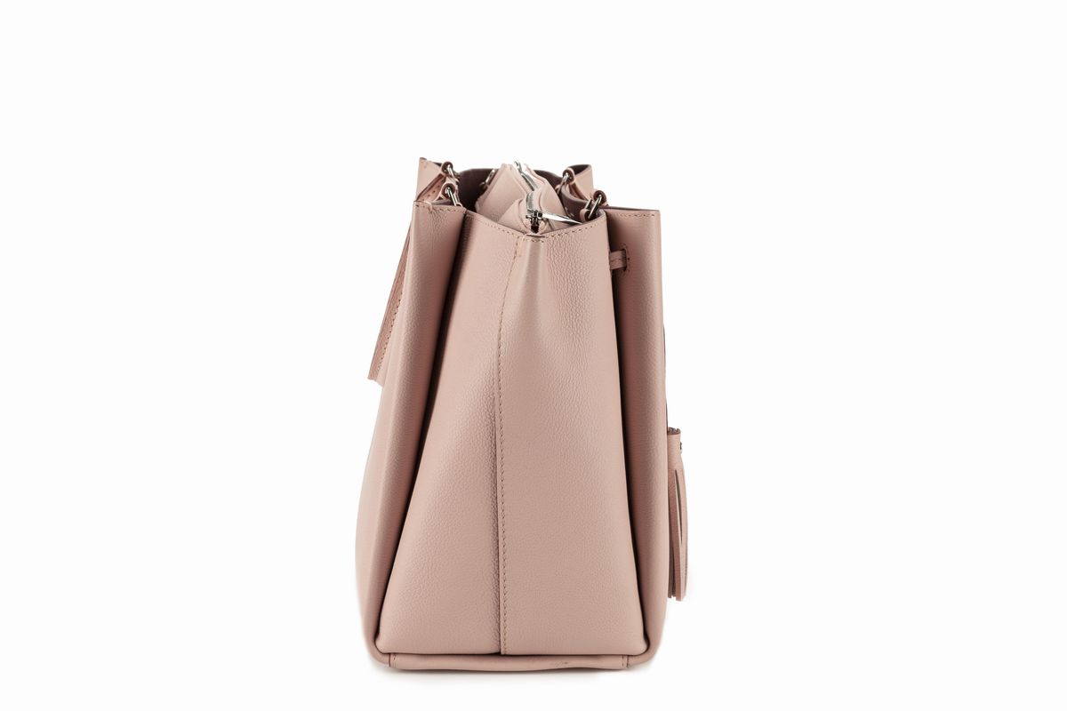 color rosa cipria, doppi manici, dettagli in metallo, tre scompartimenti interni, con tracolla, cm 30, con sacchetto (lievissimi difetti).Stima