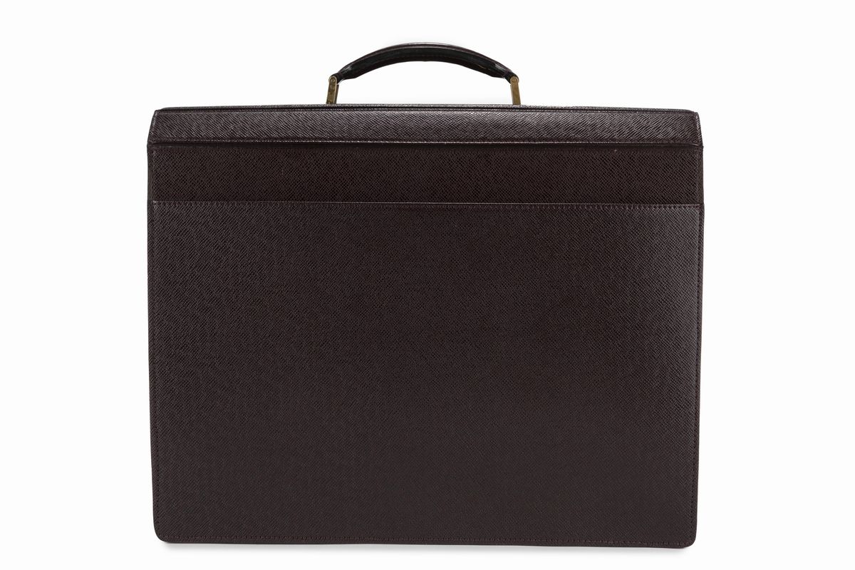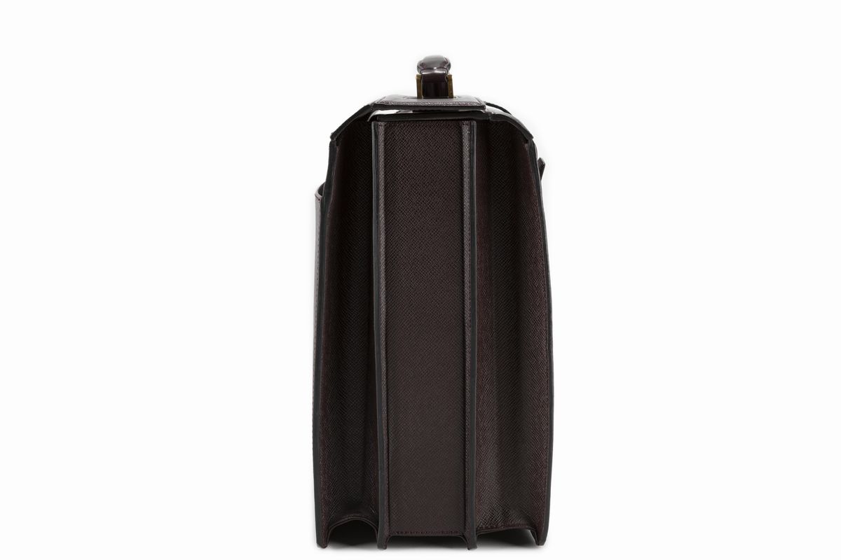 in pelle taiga, color acajou, tre scomparti interni con portapenne e porta telefono, dettagli in metallo dorato, cm 42, con sacchetto (lievi difetti).Stima