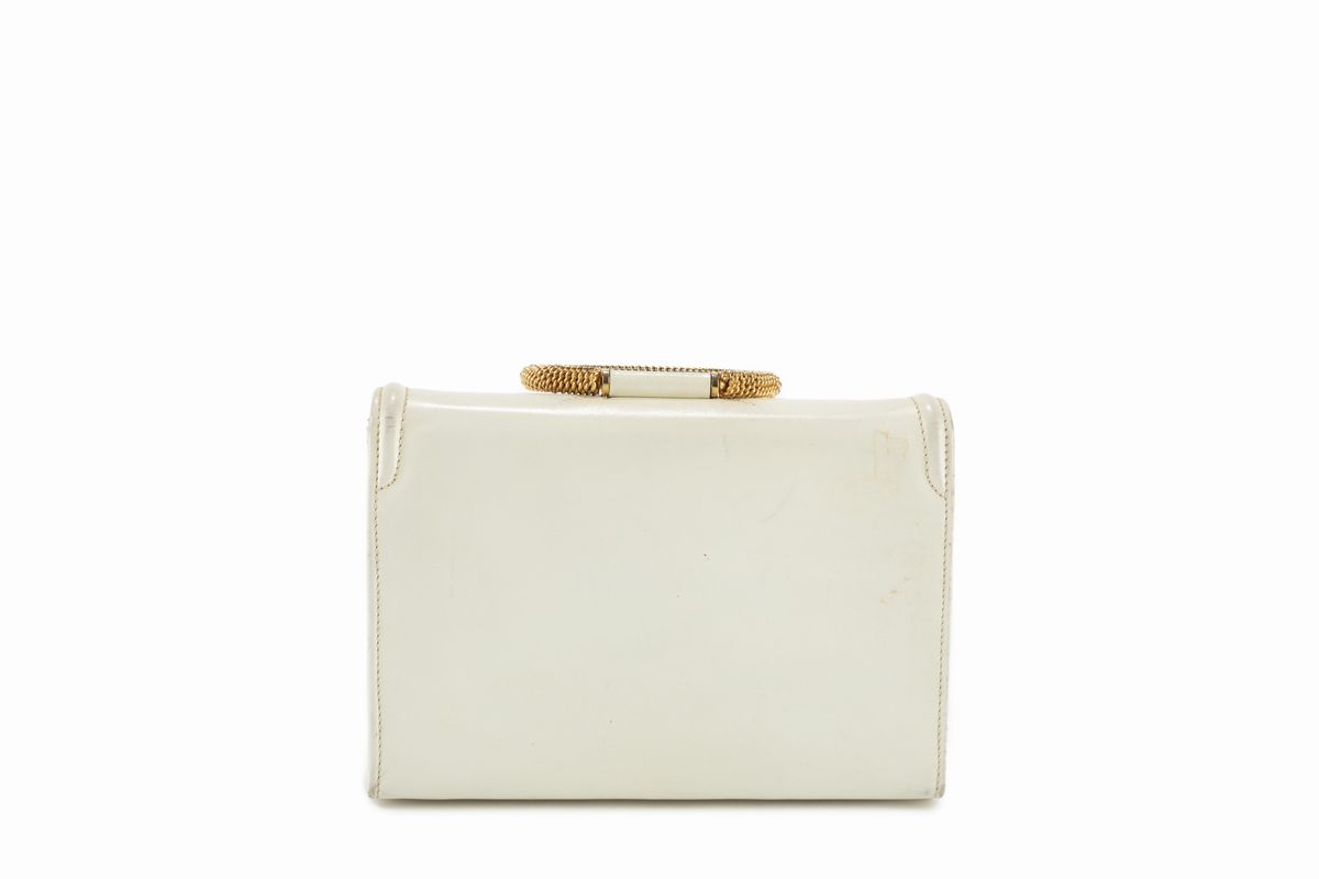 in pelle color panna con manico in metallo dorato ad anello, cm 20 (difetti).Stima