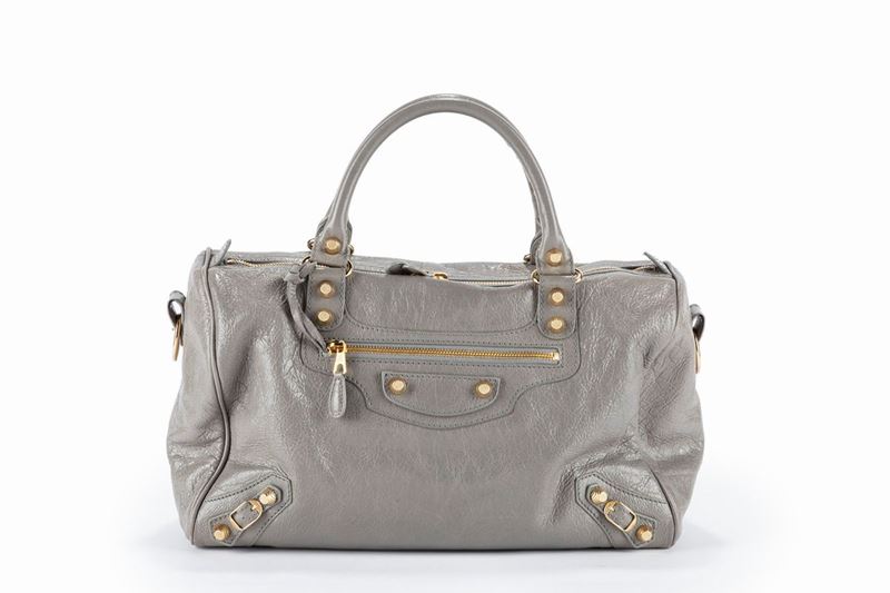 in pelle color grigio chiaro, dettagli a borchie in metallo dorato, doppi manici, con tracolla staccabile e sacchetto, cm 35 (lievissimi difetti).Base d'asta