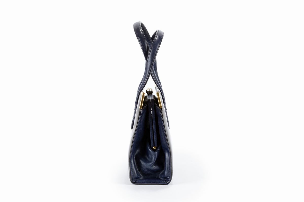 in vernice nera e pelle color bluette, doppi manici, dettagli in metallo dorato, con sacchetto, cm 23,5 (difetti).