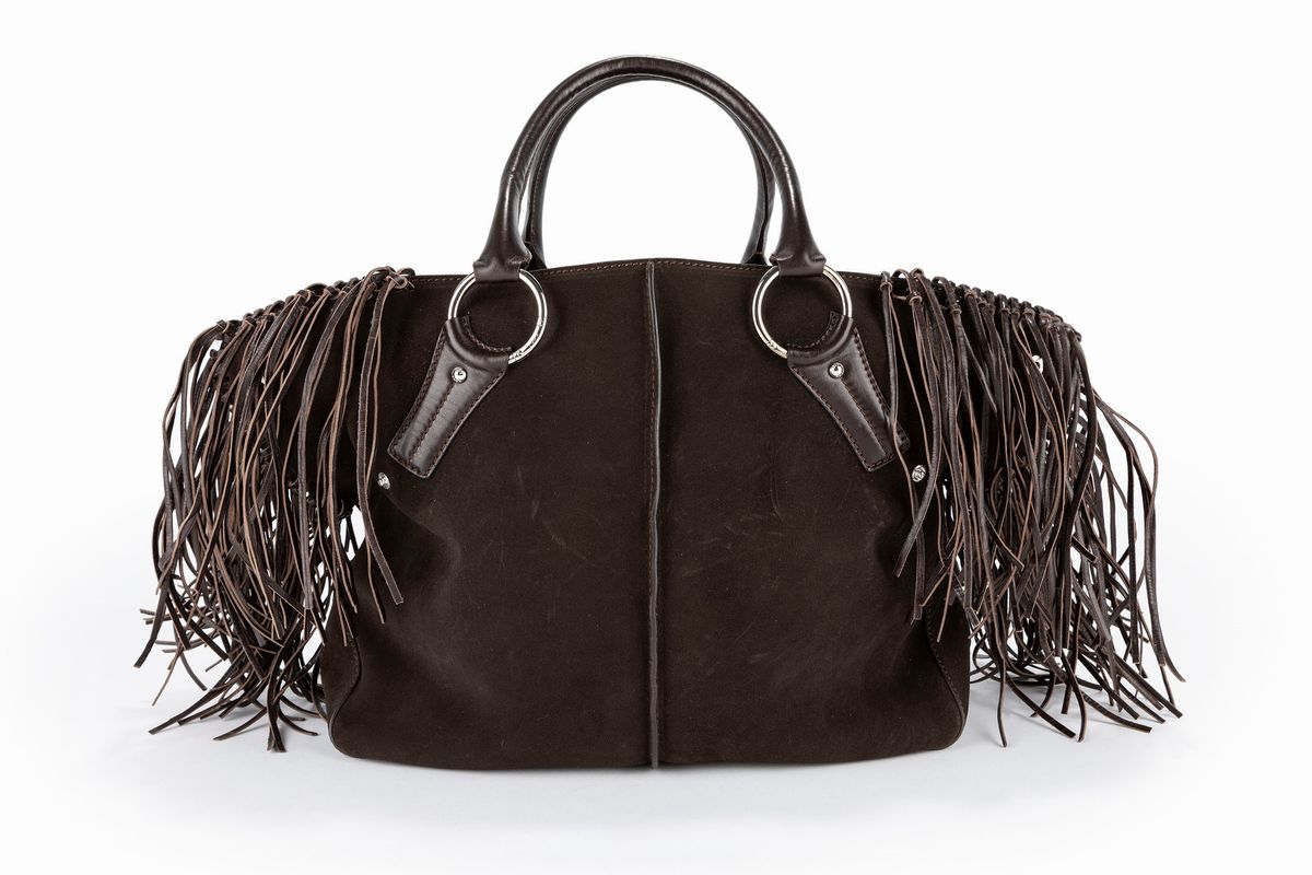 in pelle di camoscio color marrone, doppi manici, dettagli in metallo ed applicazioni di frange sui lati, cm 35, con sacchetto (lievissimi difetti).Base d'asta