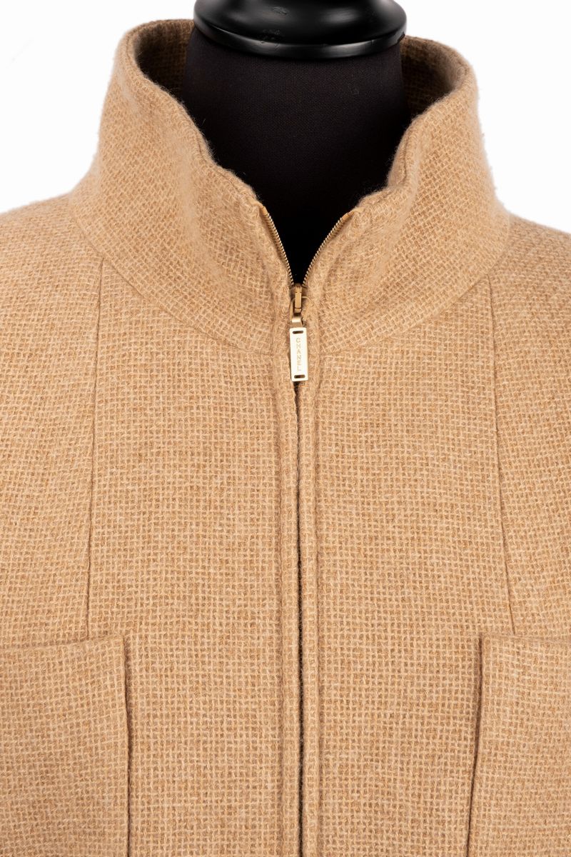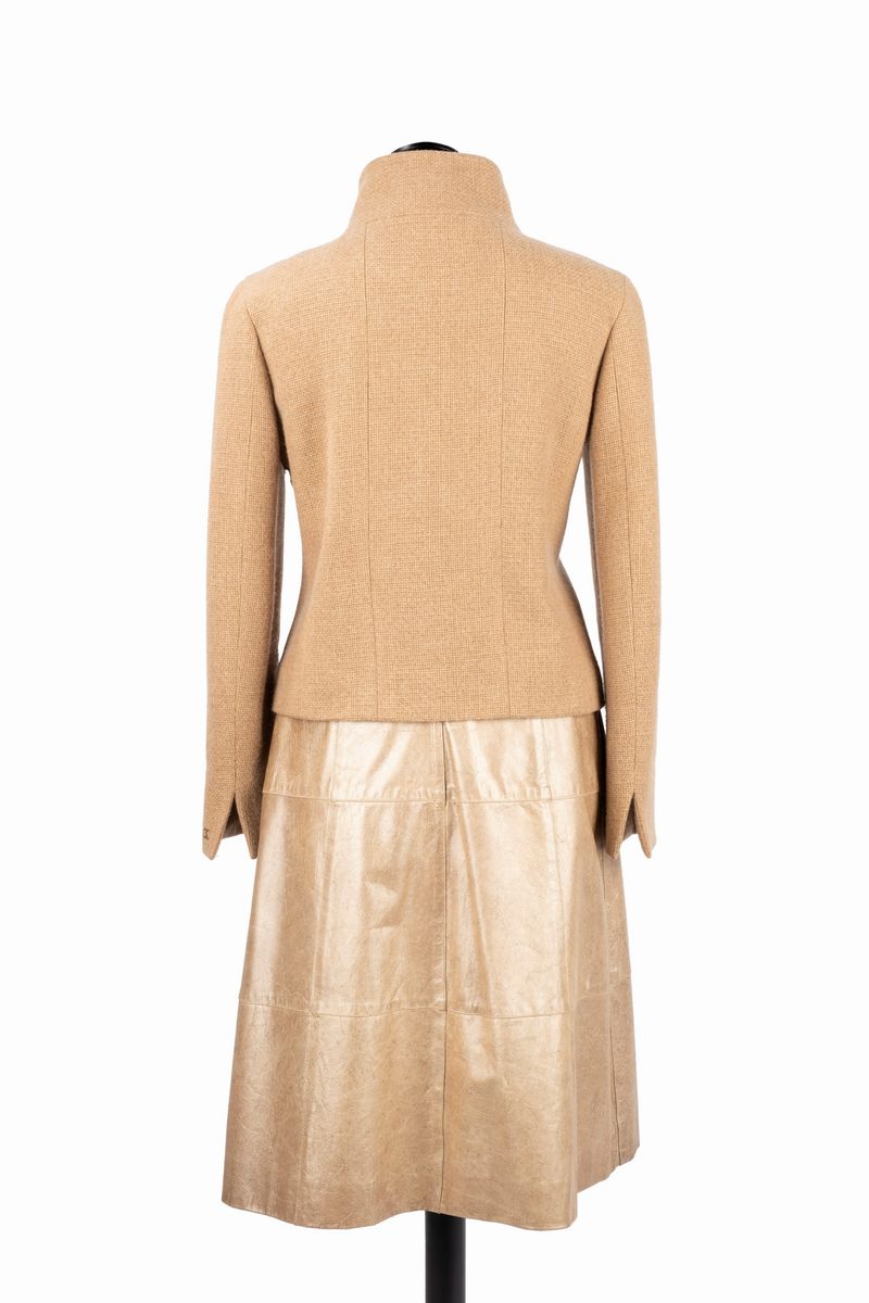 composto da un top a manica lunga in cachemire color beige con chiusura a cerniera e da una gonna in pelle color beige iridescente, fodere in seta, taglia 38 francese.Base d'asta