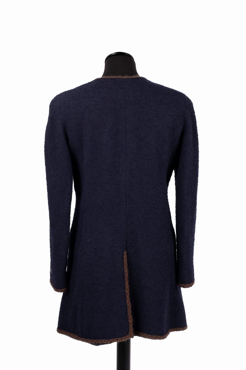 in lana bouclé color blu scuro, profili in passamaneria color marrone, chiusura a cerniera, due tasche frontali, fodera in seta, taglia 40 (lievi difetti).Base d'asta