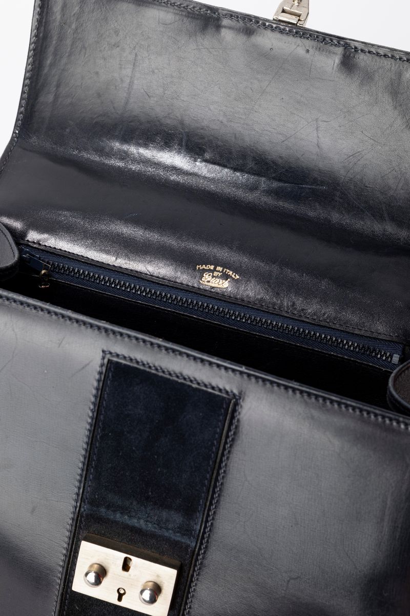Black leather and suede band handbag, lady lock metal closure, cm 26 (defects).Starting bid