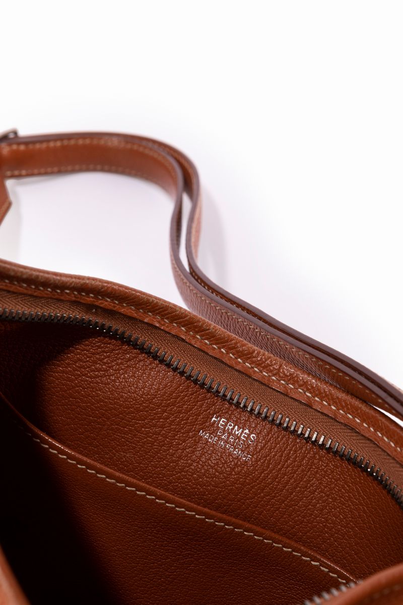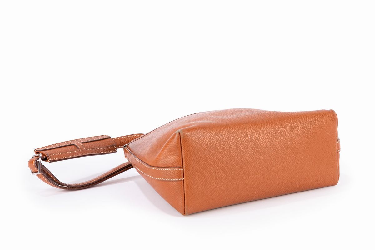 in pelle epsom color nocciola, con tracolla regolabile, chiusura con cerniera e dettagli in metallo, cm 23 (difetti).Base d'asta