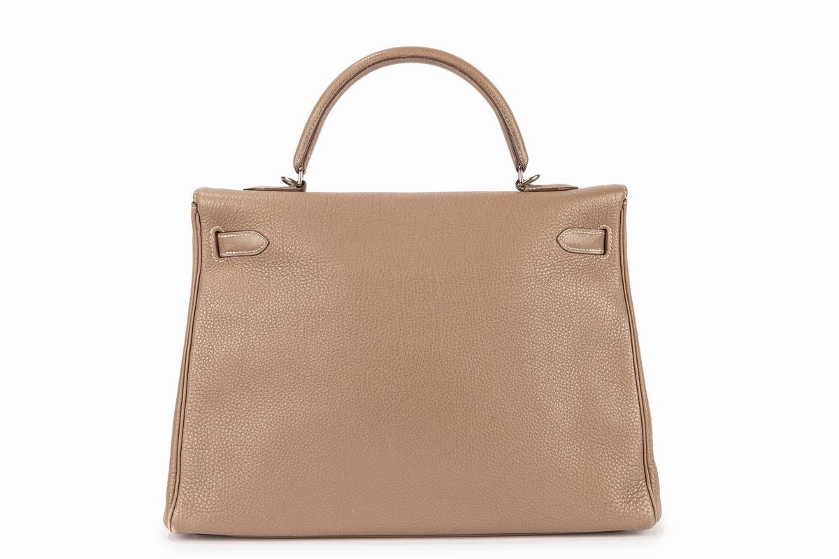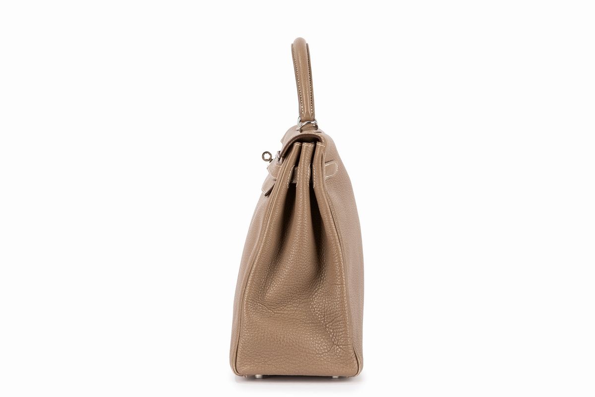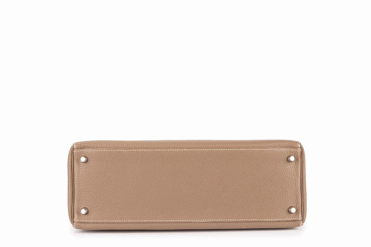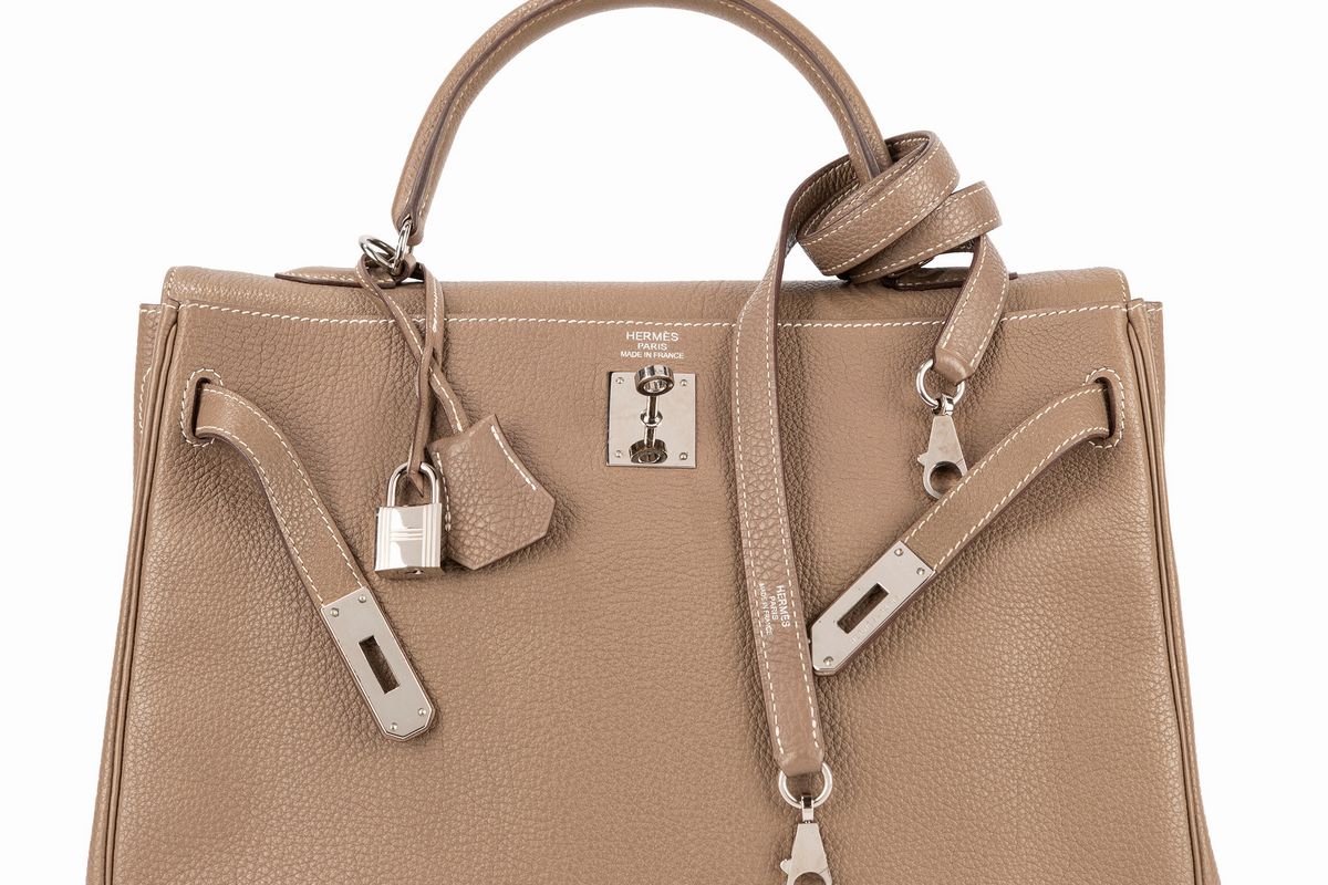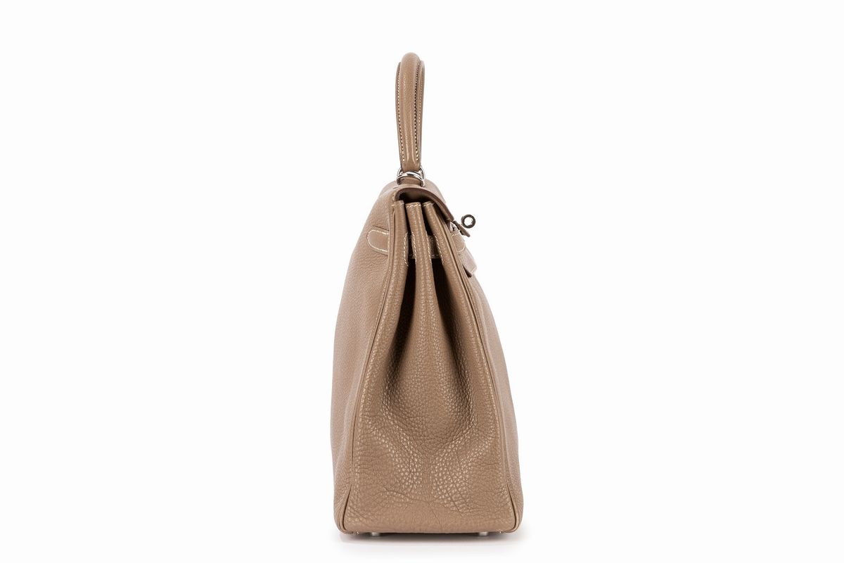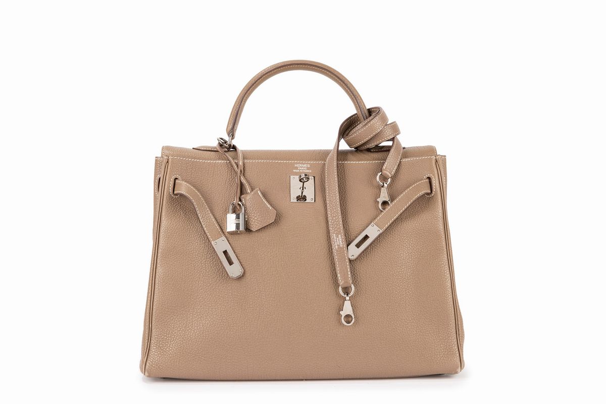 in pelle taurillon clemence color tortora, dettagli in palladio, con portamonete Bastia e tracolla, con sacchetto (difetti).Base d'asta