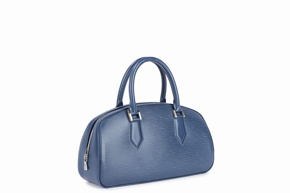 in pelle épi color blu, doppi manici, dettagli in metallo, tracolla, cm 32, con sacchetto.Base d'asta