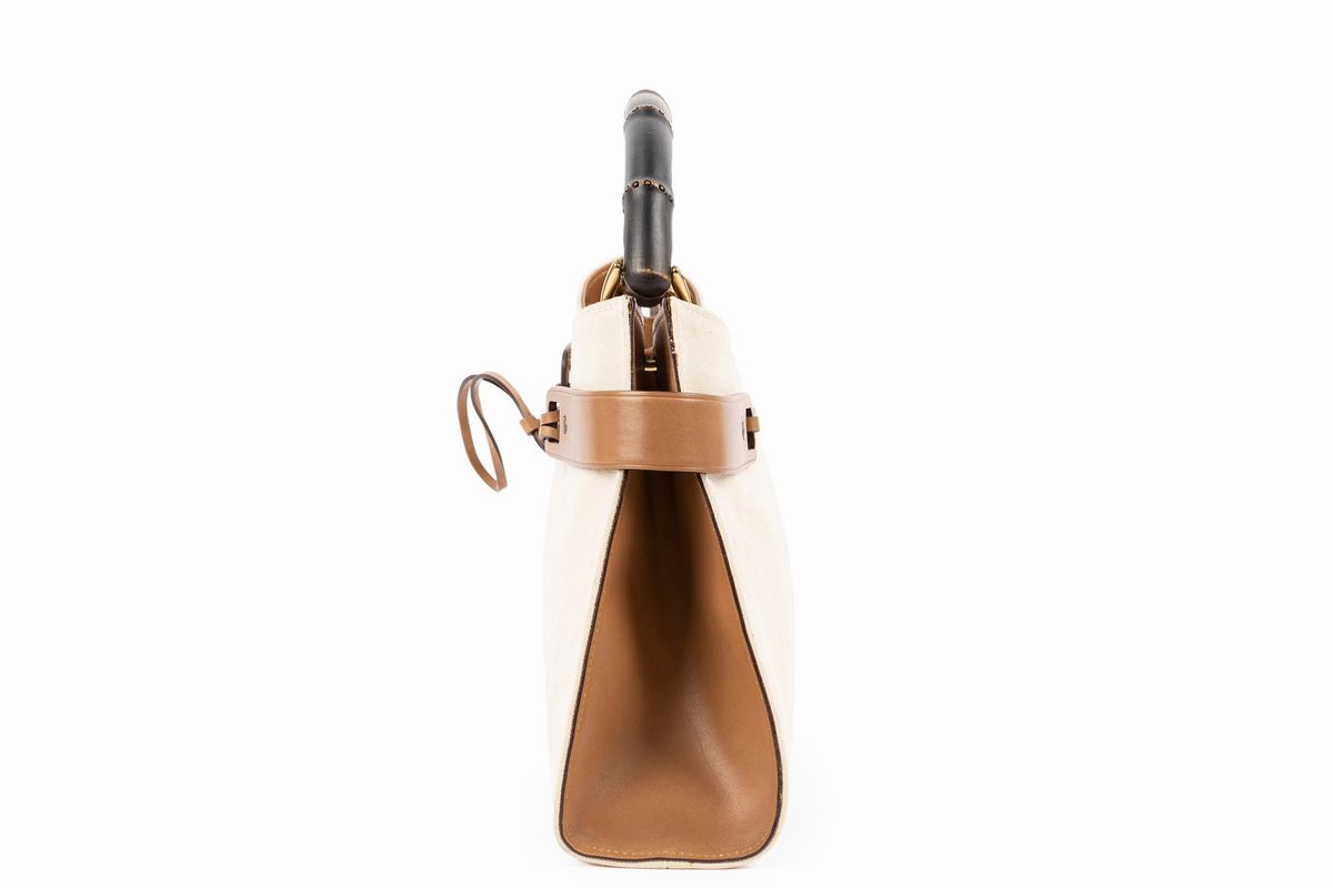in tela, color naturale, profili in cuoio, manico in bambù, cm 37, con sacchetto (lievissimi difetti)Base d'asta