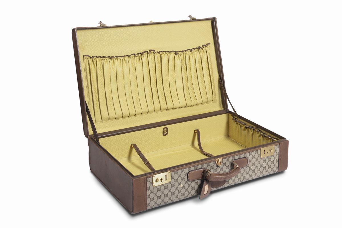 in tessuto GG plastificato e pelle di cinghiale, interno in tessuto "diamante", dettagli in metallo dorato, cm 75 x 49 x 20 (difetti)Base d'asta