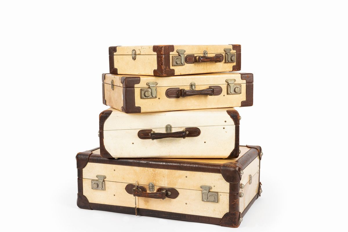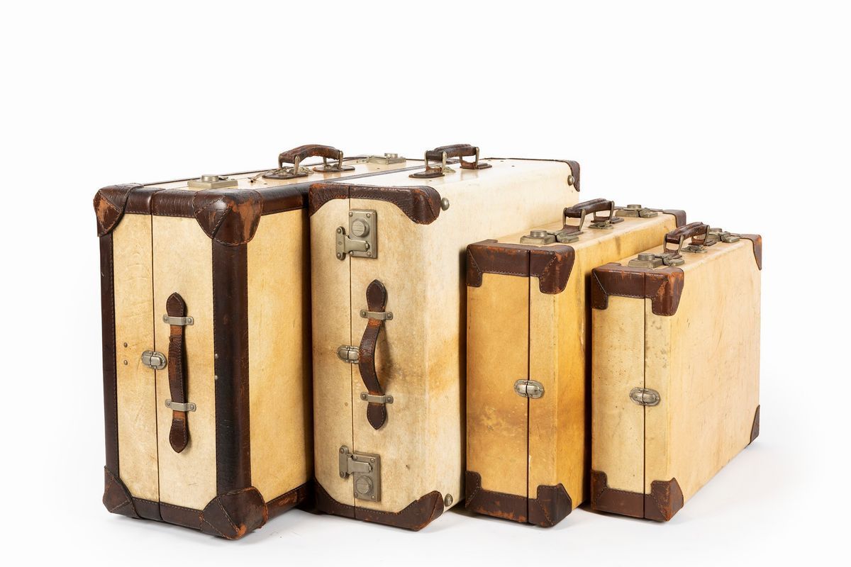 in pergamena e cuoio, dettagli in metallo, cm 55 x 40 x 14, cm 65 x 44 x 17, cm 65 x 54 x 22 e cm 82 x 53 x 28 (difetti)