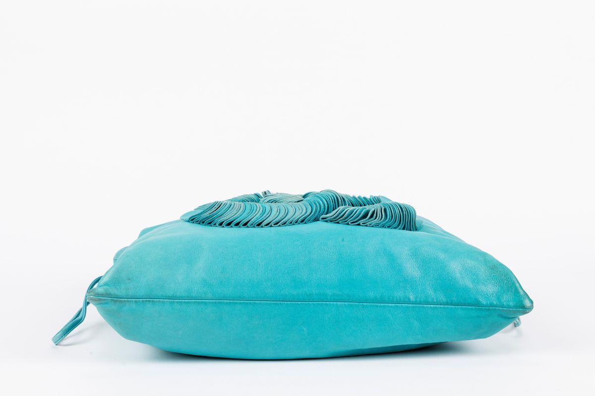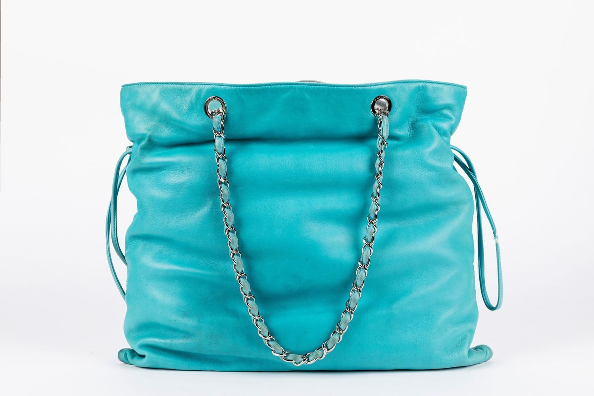 in pelle turchese, doppia tracolla a catena in metallo, cm 42, con sacchetto (difetti)Base d'asta