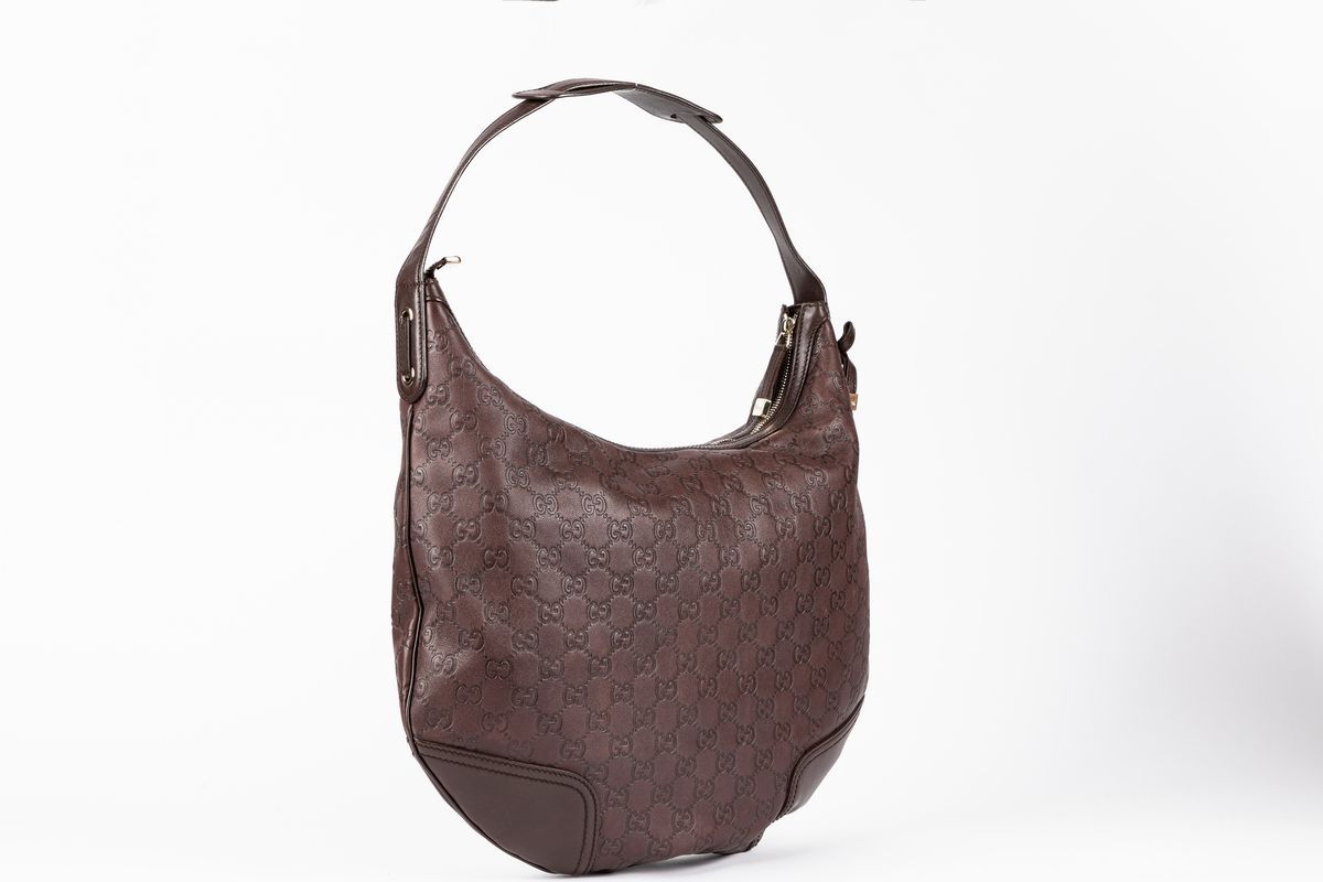 in pelle color marrone con monogram GG impresso, dettagli in metallo dorato, cm 38 (lievissimi difetti)Base d'asta