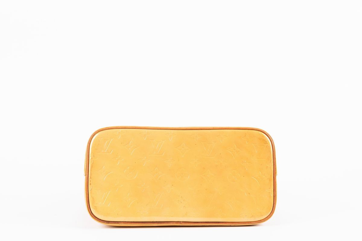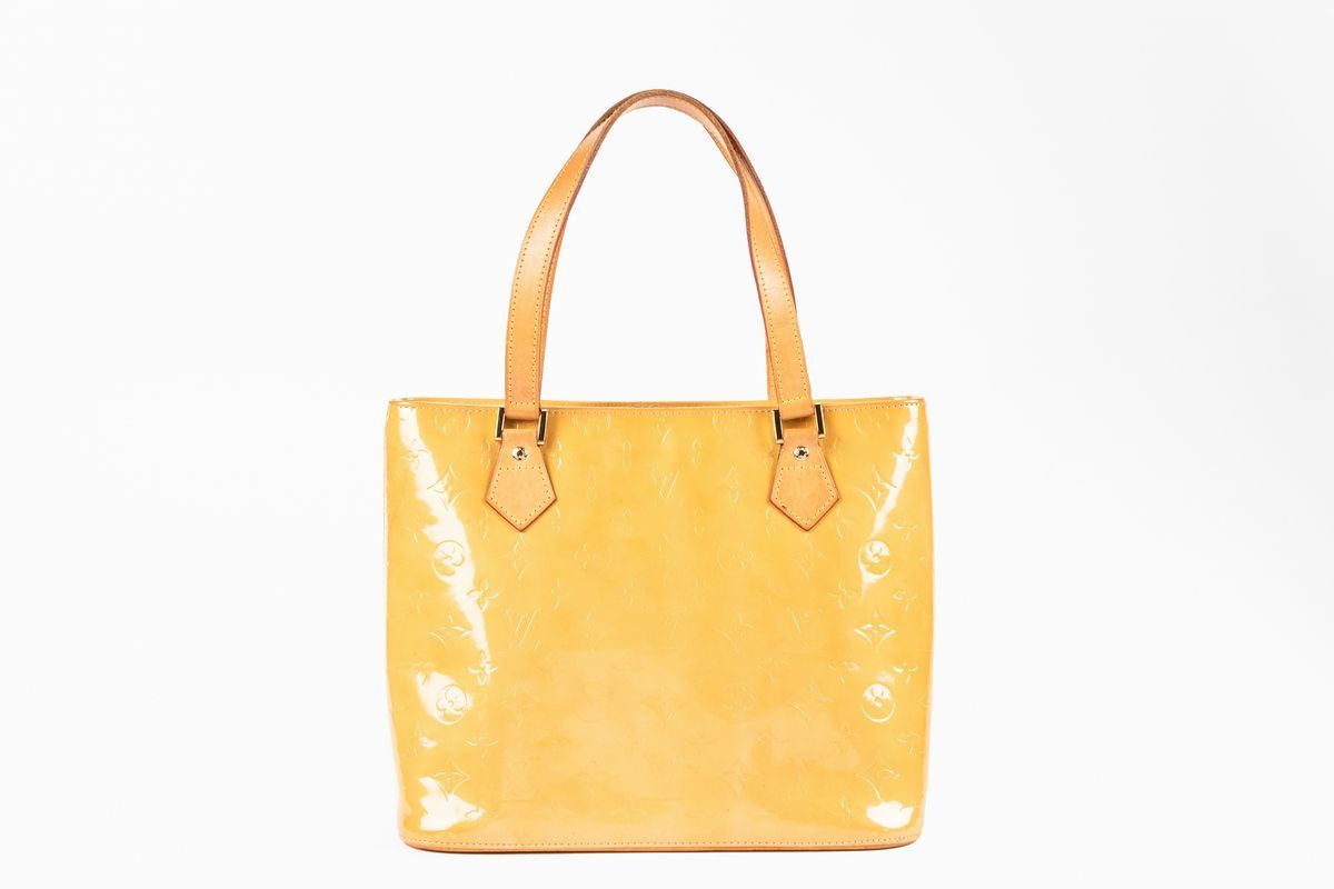 in pelle monogram vernis color giallo zafferano, manici in pelle, dettagli in metallo dorato, cm 29, con sacchetto (difetti)Base d'asta
